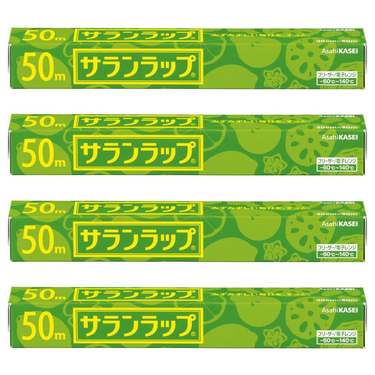 キッチンに置きたくなる、鮮やかな色あいのパッケージデザインです。大皿にも使いやすい30cm幅。たっぷり使える50m巻です。酸素や水分を通しにくいので、食品の鮮度や香りを保ちます。また、においもれや、におい移りも気になりません。サランラップの表面はとても平滑で粘着性があり、表面の滑らかなガラスや陶磁器にピタッと密着します。ハリ、コシがあってしっかりしています。引き出したり、器にかぶせたりする際に扱いやすいフィルムです。冷凍保存から電子レンジ加熱まで使えます。(耐冷温度60度~耐熱温度140度)塩分や酸に強いので、梅干し、レモンを包むのに適しています。みそにも安心して使えるフィルムです。●入数4個セット●商品サイズ(cm)幅約31.8×奥行約4.5×高さ約4.5●商品重量約378g●材質ポリ塩化ビニリデン●規格概要耐熱温度・・・140度耐冷温度・・・-60度●注意事項・火気に近づけないでください。・油性の強い食品を直接包んで、電子レンジに入れないでください。・食品包装用途以外に使用しないでください。・ガス台やオーブン、オーブントースターなど、熱に近づけないでください。ラップ同士がくっついて使えなくなります。・オーブン、グリル、オーブントースター、直火、鍋などでの煮沸や湯せんには使用しない。・電子レンジ、オーブンレンジなどの調理器具で使用する場合は、その取扱説明書に従ってください。(検索用:サランラップ さらんらっぷ 旭化成 食品包装 ラップ らっぷ 保存 キッチン 大皿 50m 4901670110180) 最強翌日配送対象商品に関するご案内 最強翌日配送対象商品・対象地域に該当する場合は最強翌日配送マークがご注文カゴ近くに表示されます。 最強翌日配送可能なお支払方法は【クレジットカード、代金引換、全額ポイント支払い】のみとなります。 下記の場合は最強翌日配送対象外となります。 ・15点以上ご購入いただいた場合 ・時間指定がある場合 ・ご注文時備考欄にご記入がある場合 ・決済処理にお時間を頂戴する場合 ・郵便番号や住所に誤りがある場合 ・最強翌日配送対象外の商品とご一緒にご注文いただいた場合 ・お届け先住所文字数が40文字以上の場合