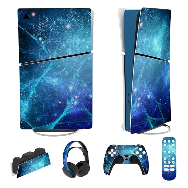 梱包サイズ:77.5cm新モデルps5 Slim本体デジタルバージョンに対応用スキンシール、ps5コントローラーに対応用スキンステッカー、ps5ヘッドセット&充電ステーション&リモコンに対応用スキンシール【青い星雲】
