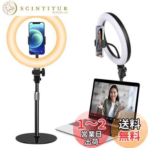 商品情報商品の説明主な仕様 ?【高品質高輝度・10インチ】このリングライトは、120箇の高輝度LEDライトを搭載し、最大800ルーメンの明るさで、デスクトップや顔をよく明るく照らす、最適な卓上リングライトです。柔らかな光なので、長時間使用しても目に負担がかかりません。安心的に使いましょう!また、影に邪魔されず、顔や物体を均一に照らす独自の無影技術を採用し、自然で明るい映像を実現。撮影、オンライン会議、ライブ配信、メイク美容化粧の照明に最適です!br?【30段階調整可能】電球色・昼光色・寒色(2900Kから6500Kまで)の三段色温度に切り替えられ、10段階の明暗調節も可能のリングライト。これにより、必要な光の色調や明るさを精確に制御することができ、過度な露出や暗さ、不適切な色合いなどの問題を効果的に防ぎ、驚くほどの美肌効果を実現します。撮影やオンライン会議、ライブ配信、メイク美容の際に女優のような美しさを放つことができます。br?【多角度調整・安定性抜群】前後180度の調節、水平方向360度の回転に対応しており、様々な照明角度に対応でき、非常に優れた撮影ライトです。リモートワークでのWeb会議や、ライブ配信、美容メイク、物の撮影など、さまざまなシーンで重宝されています。リングライトにはスマートフォンスタンドも付属し、ホルダーは360°の回転調整に対応しているため、いつでも携帯電話の撮影角度を設定できて便利です。また、スマホクリップの幅は約10.5cmまで拡張可能で、ほぼ全てのスマートフォンにサポート。台座部分は合金素材で作られており、スタイリッシュでシンプルで美しいだけでなく、安定性と耐久性にも抜群、転倒しやすいという従来品の欠点を回避しています。br?【汎用USB-A給電・シンプルな操作】リングライトの出力は10Wに達し、PC/モバイル電源/USBアダプターなど、様々なデバイスと組み合わせてUSBで給電でき、電源問題を心配する必要がありません。リングライト本体には長さ1.8mのUSBケーブルを搭載し、長さに余裕があります。ケーブルには操作がシンプルなリモコンが付いているので、日常使いにも便利です。なお、リングライトへの給電は5V2A (10w)で行ってください。そうでないと明るさが不足したり、点灯しないなどの問題が発生しますのでご了承ください。br?【より美しくなりたい】リングライトは、撮影、配信ライブ、照明、Zoom会議、女優、自撮り、テレワーク、リモート、オンラインワークなど、様々な使用シーンで大活躍。照明によって自分の肌を写真や動画でより白く美しく見せたい人に最適です。?24ヶ月ブランド保証?:お客様に信頼される会社となることを目標として日々努力しております。弊店の商品には2年間の保証期間がございます。期間中に万が一商品に何か問題がございましたら、いつでも弊店にご連絡ください。弊社は24時間体制で日本語サポートを提供しておりますので、安心してご購入ください。