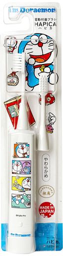 アイムドラえもんがデザインされた電動歯ブラシです。 やわらかめ超薄型コンパクドヘッド/フラット/三列植毛/替ブラシ1本付き