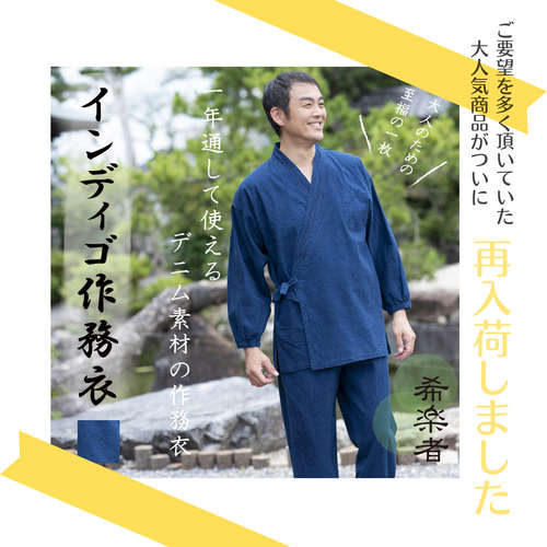 待望の再入荷!粋に着こなす、大人のインディゴ作務衣。インディゴ作務衣 メンズ 綿素材 上下セット 部屋着 ルームウェア 散歩 温泉 旅行 お出かけ 在宅 リラックスウェア 父の日 敬老の日 ギフト プレゼント Japan
