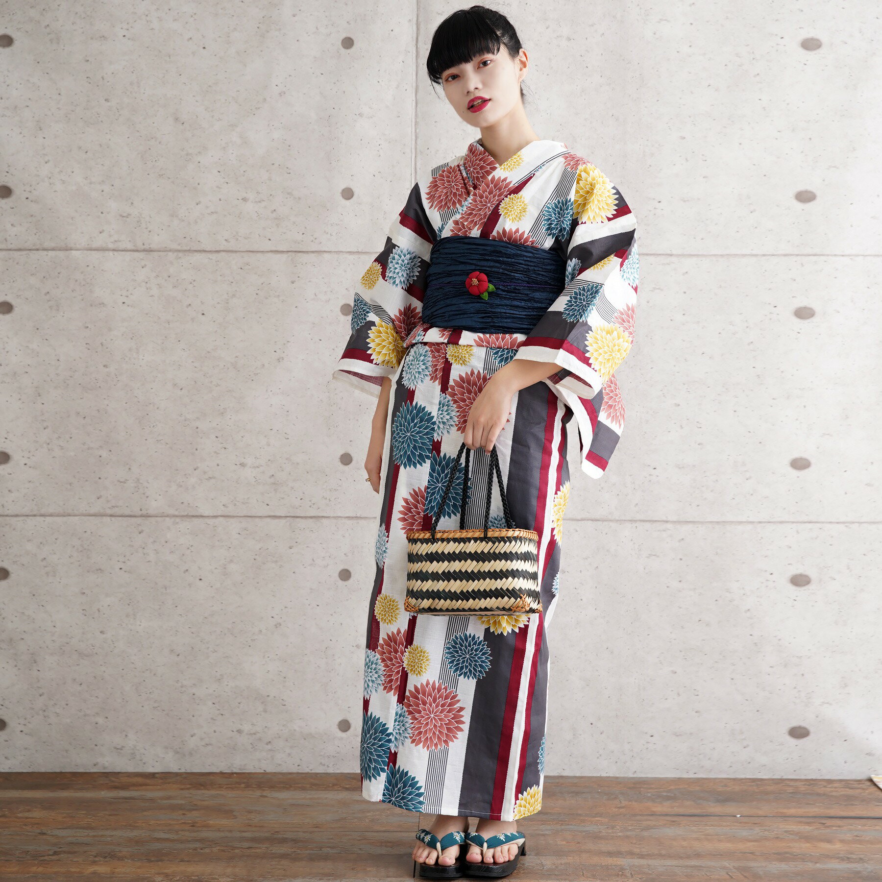 浴衣 セット 浴衣セット ゆかた レディース【ニコアンティーク 高級変わり織 浴衣3点セット えんじミッドセンチュリーストライプ】 ゆかた 帯 下駄 セット レディース フリーサイズ 大正浪漫 個性的 レトロ 大人 女性 白 グレー 青 菊 花柄 ストライプ