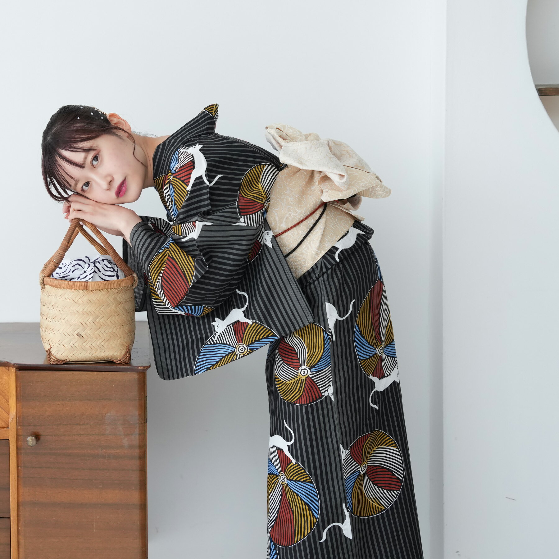 浴衣はひとりで着られる!レディース浴衣セット カンタンゆかた着付け動画公開中!【ニコアンティーク 高級変わり織 浴衣3点セット 大正浪漫ブラックグレー縞に鞠猫】 個性派きものブランドNicoAntiqueの新作 フリーサイズ 浴衣セット(ゆかた・帯・下駄) レトロ 国産生地