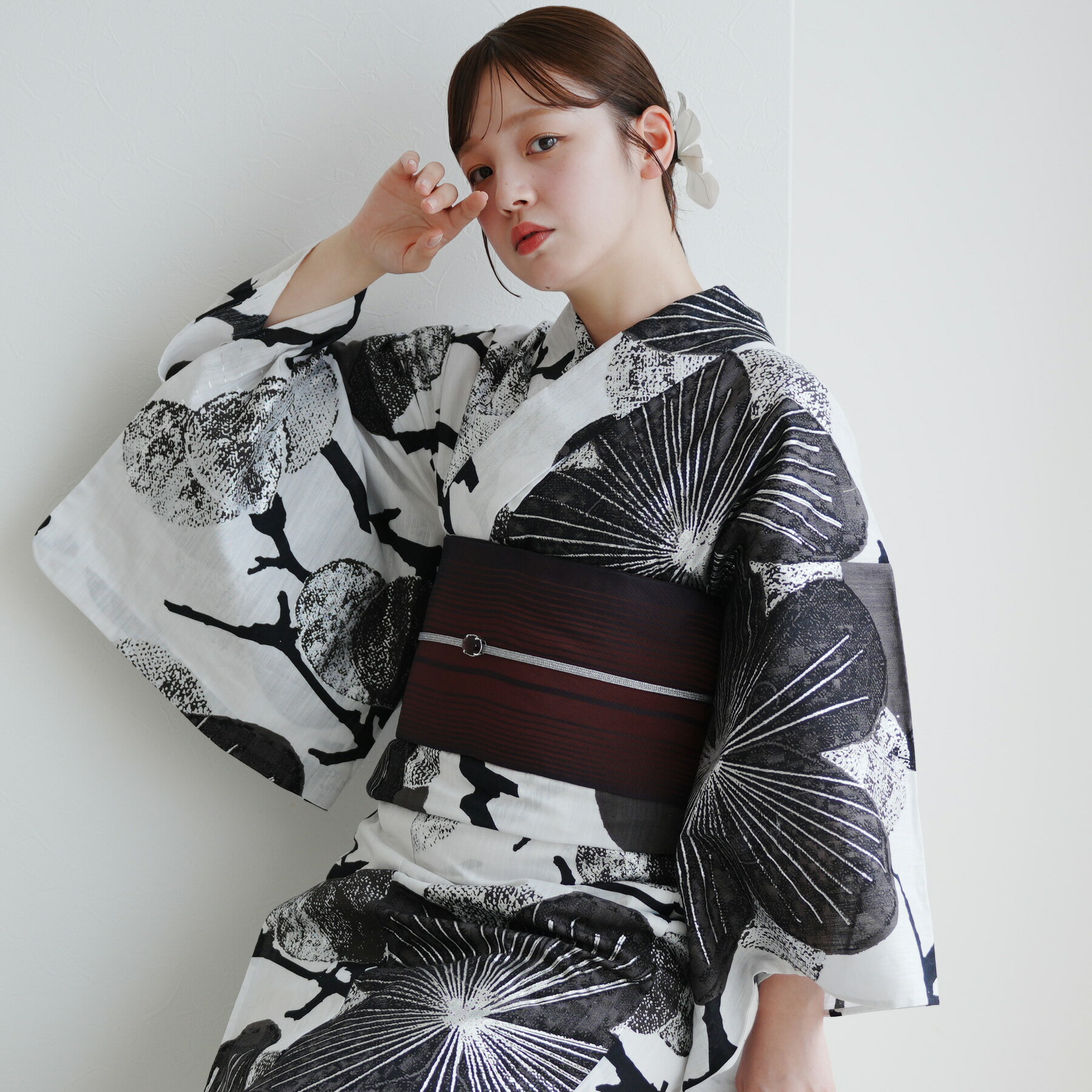 浴衣はひとりで着られる!レディース浴衣セット カンタンゆかた着付け動画公開中!【誉田屋源兵衛 日本製小幅生地使用 浴衣3点セット 桜花抄 白/チャコール銀】綿75%麻25% 綿麻 麻混 特選 フリーサイズ 浴衣セット(ゆかた・帯・下駄)ですぐお出かけ 日本製 国産 手縫い併用国内縫製