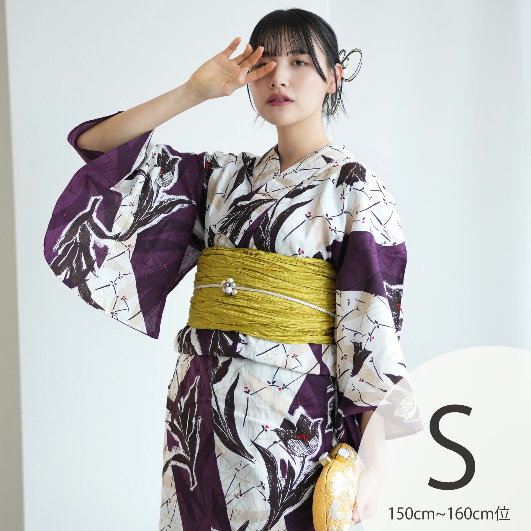 浴衣はひとりで着られる!レディース浴衣セット カンタンゆかた着付け動画公開中!【ニコアンティーク 高級変わり織 浴衣3点セット オールドチューリップ パープル】 個性派きものブランドNicoAntiqueの新作 プチサイズ(150-160cm)Sサイズ 浴衣セット(ゆかた・帯・下駄) レトロ 上質 国産生地 国内染色 低身長コーデ