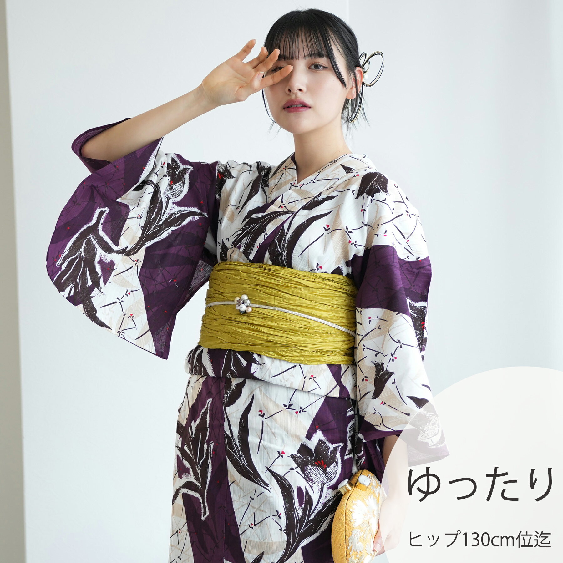 浴衣はひとりで着られる!レディース浴衣セット カンタンゆかた着付け動画公開中!【ニコアンティーク 高級変わり織 浴衣3点セット オールドチューリップ パープル】 個性派きものブランドNicoAntique ゆったりサイズ(ヒップ約130cm位まで)3Lサイズ 浴衣セット(ゆかた・帯・下駄) レトロ 上質 国産生地 国内染色