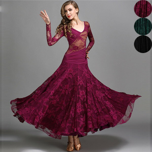 S-3L 社交ダンス ドレス 長袖 広がる裾 発表会 競技着 練習着社交ダンス衣装 社交ダンス ドレス 社交 ダンス練習着 ワンピース 長袖 広がる裾 花柄 レッスン着 発表会 競技着 練習着 演出用 スタンダード ワルツ専用ドレス オールシーズン ワインレッド ブラック グリーン ブルー ワインレッド パープル S M L XL 2XL be187zbzbx0