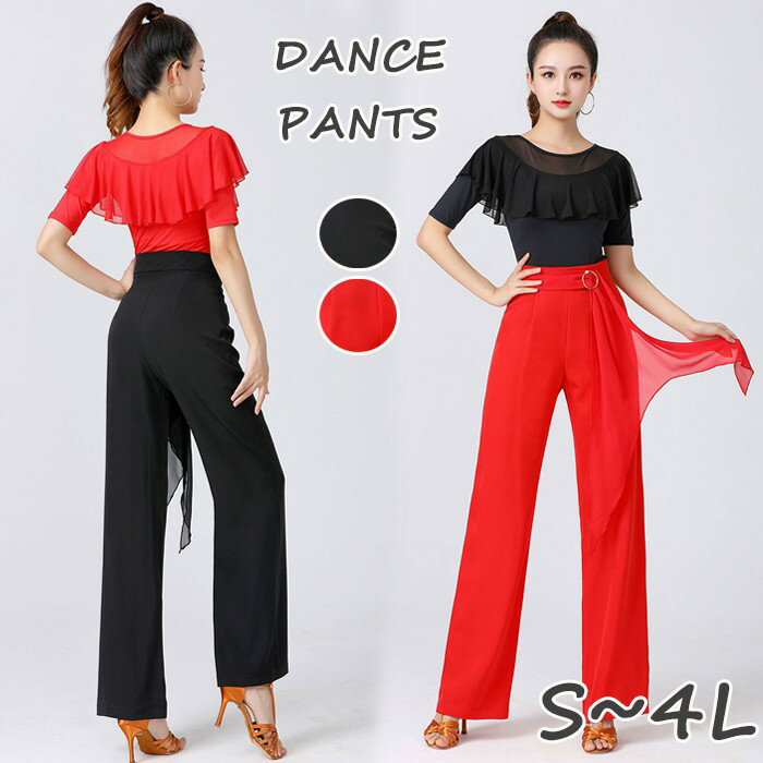 ラテンダンスパンツ レディース ワイド パンツ モダン 社交ダンス 練習着 練習着ダンスパンツ レディース ワイド パンツ ラテンダンスパンツ モダン 社交ダンス 練習着 練習着 パンツ ロング 長ズボン フリル ひらひら ダンス ボトムス 演出服 着痩せ 大きいサイズ有 赤 黒 S-3XL