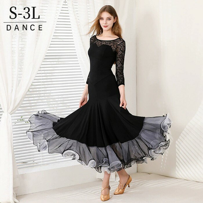 S-3L 社交ダンスドレス モダンドレス 黒 長袖 大きい裾社交ダンス衣装 社交ダンス ドレス 社交 ダンス練習着 モダンドレス 透け感 黒 ブラック フリル レース 長袖 大きい裾 モダン スタンダード ワルツ レディース ワンピース ダンス衣装 イベント パーティー S M L 2L 3L d1371d7d7x0