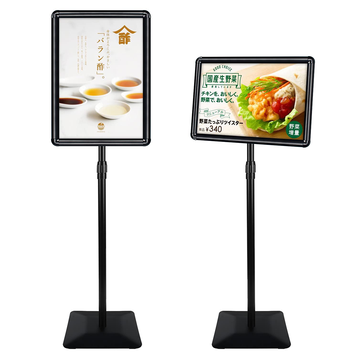 ・案内板ベースはステンレス板ベースにアップグレードされ、重さは3kgに達する、とても安定して使用されます。床を保護し、摩擦を防ぐために、ベースの下側には滑り止めのスポンジもあります。・高さと角度の調整: A3案内板の高さが調整できる範囲は780-1380 mmです。フレーム角度は360度回転できます。ポールの直径は30mmです。(A 4画面サイズ:210 x 297 mm/A 3画面サイズ:297 x 420 mm)・PVC保護フィルム:案内板のフレームには PVCの防護カバーが含まれており、ほこりや指紋、悪天候を防ぐことができます。ポスターの鮮明度を効果的に保護します。・多用途人気立て看板:優れたポスター展示アシスタントで、店舗看板、結婚式、レストラン、展覧会、コンサート、ホテル、ショッピングセンター、オフィス、学校、病院など多くの場合に適しています。広告、ポスター、販促割引、情報通知などの展示に用いられます。安定した性能は室内室外でも適用されます。・適格請求書が発行できます。