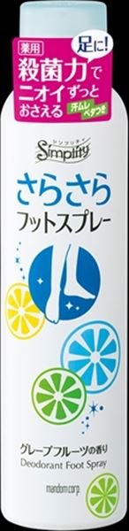 【ご注文について】お客様のご都合による商品のキャンセル・交換・返品は一切承ることが出来ません。ご注文の際は慎重にお選びの上、ご注文願います。当店からの確認メールや、ご入金確認のメールが配信されない場合がございます。その場合は、商品発送(出荷)のメールをご確認下さい。【納期について】ご注文(ご入金)確認後3~7営業日前後の出荷予定※商品によっては一時的なメーカー欠品・取り寄せ等の理由により、上記出荷予定より更にお時間がかかる場合がございます。また、当該商品は他店舗でも在庫を共有しておりますので、在庫更新のタイミングにより在庫切れの場合、やむを得ずキャンセルさせて頂く可能性があります。【送料について】こちらは『同梱区分Q : 1配送先756円(※北海道・沖縄・離島は配送不可)』が適用されます。※『異なる同梱区分の商品』を一緒にご注文頂いた場合は、同梱が出来ません。別配送となり追加送料がかかりますので、ご注文後に訂正の上、ご連絡させて頂きます。(送料は自動計算されません。出荷は保留扱いとなります。)メーカーからの出荷となる場合もございます。納品書は同梱しておりません。ラッピング(包装)・のしがけは承ることが出来ません。配送業者のご指定不可。置き配は破損・汚損・紛失・盗難などの恐れがあるため、原則としてお断りしております。置き配による破損・汚損・紛失・盗難については保証ができかねますので、あらかじめご承知おきください。シンプリティさらさらフットスプレー商品区分:医薬部外品●高い殺菌力で気になる足のニオイをずっとおさえるさらさらフットスプレー●殺菌成分配合で足のニオイをしっかり防ぐ&制汗成分配合で足汗をおさえる●さらさらパウダー配合でスプレーした瞬間から快適素足に●すっきり爽快なグレープフルーツの香り【販売名】フットスプレーNB【販売名】シンプリティ さらさらフットスプレー【使用方法】・使用前に缶を上下に強く4?5回振り10cm以上はなしてスプレーしてください。【成分】有効成分・・・パラフェノールスルホン酸亜鉛、イソプロピルメチルフェノールその他成分・・・LPG、無水エタノール、オクテニルコハク酸トウモロコシデンプンエステルアルミニウム、デシルテトラデカノール、1.3-ブチレングリコール、L-メントール、L-メンチルグリセリルエーテル、イソノナン酸イソノニル、チャ乾留液、香料【注意事項】・お肌に異常が生じていないかよく注意して使用してください。・傷やはれもの湿疹等異常のあるときは使わないでください。また赤み・はれ・かゆみ・刺激・色抜け(白斑等)・黒ずみ等の異常があらわれたときは使用を中止し皮フ科医等へご相談ください。そのまま使用を続けると症状が悪化することがあります。・皮フ科医等にご相談の際は全成分情報が必要となることがありますので箱を大切に保管してください。・目に入らないように注意し入ったときはすぐに洗い流してください。・メントールの冷感刺激に弱い方は使用をお控えください。・揮発成分が目にしみることがあります。・子供の手の届かないところに置いてください。【原産国】日本【ブランド】シンプリティ【発売元、製造元、輸入元又は販売元】マンダムリニューアルに伴い、パッケージ・内容等予告なく変更する場合がございます。予めご了承ください。(Simplity)マンダム540-8530 大阪府大阪市中央区十二軒町5-120120-37-3337●広告文責:株式会社プロヴィジョン(tel:092-985-3973)