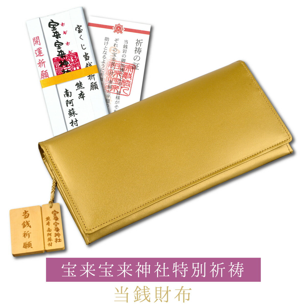 金運にご利益のある神社で祈祷!祈願を届ける祈願札付きの財布。宝来宝来神社特別祈祷の金運財布!御祈願用のワレ木札付き!お願い事を宝来宝来神社に届けてください!商品説明◆開運ディレクターより・・・宝くじ当選祈願で有名な宝来宝来神社監修と特別祈祷を受けた特製長財布。金色と当選を象徴する図案が金運の高まりを予感。宝くじの保管用でも活躍すること間違いなし!?あの宝来宝来神社の特別祈祷を受けた開運財布です。付属の二つ折りの御守り札は、片方にお名前やお願い事を書き、宝来宝来神社にてさらなる祈祷を受けられます。商品番号 [ Item No ]T00086販売名 [ Item name ]宝来宝来神社特別祈祷『当銭財布』主な素材 [ material ]・牛革・レーヨン・ファスナー御守り:ヒノキ色 [ color ]ゴールドサイズ [ size ]サイズ(約):縦90mm×幅190mm×厚み23mm 重量100g商品仕様 [ spec ]財布本体×1(カード入れ×12・札入れ・小銭入れ・背ポケット×1・フリーポケット×4・御守り用シークレットポケット)特別祈願セット(二つ折り御守り札・専用受付封筒・当銭御守り)特別祈願は二つ折り御守り札と専用受付封筒をご利用ください。特別祈願には別途料金は発生しません。※少量ハンドメイド生産品につき、色味や細部の仕上げ、サイズや重量等に若干の個体差があります。商品を表すキーワード[ tags ]開運グッズ 開運アイテム 運気アップ スピリチュアルグッズ 御守 たまふりや 金運アップ グッズ 金運グッズ おまもり お守り 御守 神社 祈祷済み お祓い 金運 熊本 ほぎほぎ財布 護符 たまふり屋の開運グッズ スピリチュアル 運命を変える 運命を拓く 幸せを呼ぶ 幸福の習慣宝くじ当選祈願で名高いあの宝来宝来神社特別祈祷! 大望の財布が遂に誕生!熊本県南阿蘇村にある宝来宝来神社は、「当銭岩」を御神体とする宝くじ当選に絶大な御利益のある神社として全国にその名を轟かせています。テレビ番組にも度々紹介され、各地から宝くじ当選祈願に訪れる人びとが後を絶ちません。そんな宝来宝来神社の公認を得た待望のお財布『宝来宝来当銭財布』が、ついにたまふり屋に誕生しました。当銭祈願の工夫が随所にほどこされた類を見ない財布です。ぜひ一刻も早く手にして、宝くじ当選の夢を祈願してみませんか?お買い上げの方限定! 宝来宝来神社「一日参り祈願祭」であなたの当銭を祈願!お財布が届きましたら、まずファスナートップの先をご覧ください。そこには黄金の根付紐で結ばれた「当銭祈願御守」がセットされています。桧でできたこの御守は、よく見ると溝が刻まれています。その溝に沿って力を加えると御守が2つに割れ御札となります。「当銭祈願」の印字があるほうの裏側に、あなたの願いや名前を書き記し、同梱されている宝来宝来神社御祈祷受付係行きの封筒に入れてお送りください。御札が神社に届いた直近の月初め、1日午前零時に行われる「一日参り祈願祭」で、あなたの当銭、金運、開運、招福を祈願いたします。これであなたの願いがお財布を通して当銭岩様とつながることを意味します。財布のパワーをより一層高める、宝来宝来神社のありがたい御神紋と当銭御守!財布のフラップを開くと、宝来宝来神社の御神紋がエンボス加工でさり気なく配されています。小銭入れの中には様々な御守りを収めるシークレットポケットがあり(まずは同梱されている当銭御守をお入れください!)、金運招来に不可欠な「財布の中の整理整頓」をしやすいよう、札入れ、フリーポケット4、背ポケット1、カード入れ12という多彩な収納をご用意。もちろん宝くじを入れて当銭祈願をするにも最適です。