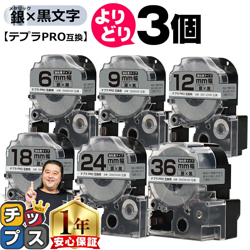 強粘着 メタリック銀地/黒文字 6mm 9mm 12mm 18mm 24mm 36mmから好きな幅を3個選べる キングジム対応(KING JIM対応) 平日土日祝日配送 宅急便 送料無料 ★安心1年保証★自由選択3個 テプラPRO用互換 SMXW キングジム対応 強粘着 メタリック銀 黒文字 6mm/9mm/12mm/18mm/24mm/36mm (テープ幅) テプラPRO用互換テープ 互換テープ