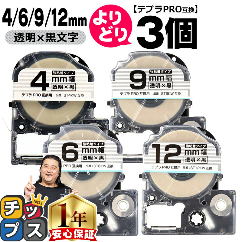 強粘着 透明/黒文字 4mm 6mm 9mm 12mmから好きな幅を3個選べる キングジム対応(KING JIM対応) 平日土日祝日配送 宅急便 送料無料 ★安心1年保証★自由選択3個 テプラPRO用互換 STKW キングジム対応 強粘着 透明 黒文字 4mm/6mm/9mm/12mm (テープ幅) テプラPRO用互換テープ 互換テープ 透明テープ 透明ラベル