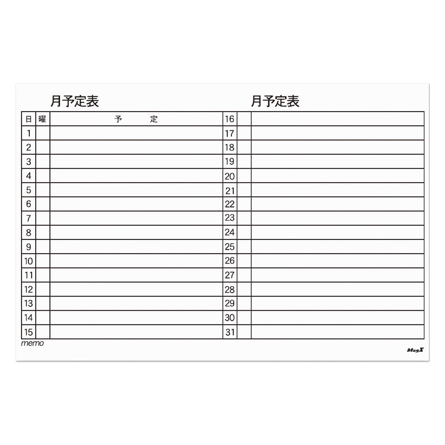 ・【仕様】月間予定表・【製品サイズ】厚み0.6×横870×高さ570mm (1枚入/箱)・【内枠寸法】(日/曜)縦30×横30mm、(予定)縦30×365mm・【重量】約0.9kg/枚・【付属】ボードマーカー(黒・赤)、マグネット付トレイ、マグネット付イレーザー説明 スチール壁面を有効活用できるシートタイプの月予定表 「マグネットホワイトボードシート」に月間予定が印刷されているシリーズ たっぷり書ける大判シートタイプの月間予定表。 規格より小さめサイズなので、ホワイトボードやパーテーションや貼って使うのもおすすめです。 内枠寸法:(日/曜)縦30×横30mm、(予定)縦30×365mm 【その他特徴】 ・日本製のフィルムなので、ホワイトボードマーカーの消去性が抜群に良い。 ・付属品あり(ボードマーカー黒・赤/マグネット付トレイ/マグネット付イレーザー) ・はさみやカッター等で切れる。 商品仕様 ●下地/白 ●印刷内容:月間予定表 ●材質/PETフィルム、マグネットシート ●ホワイトボードマーカーでの書き消し可能 ※消えにくい場合:ホワイトボード用クリーナー(MWC-60・MWC-300)を使用。汚れにシュッとひと拭きして、柔らかい布などで拭き取る。 【ご注意】スチール面に貼った時でないと、マグネット製品を利用できません。