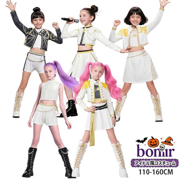 仲間と一緒に、キラキラのパフォーマンスを楽しもう!アイドル風 K-POP 女の子 可愛い 子供 ハロウィン 衣装 魔法少女風衣装 ハンターガール 黒白 キラキラ 個性 スパンコール ジャケット タンクトップ スカート 短パン 演劇 文化祭 コスプレ コスチューム 仮装 ダンス衣装 キッズ イベント 万聖節 パーティー 100~160cm