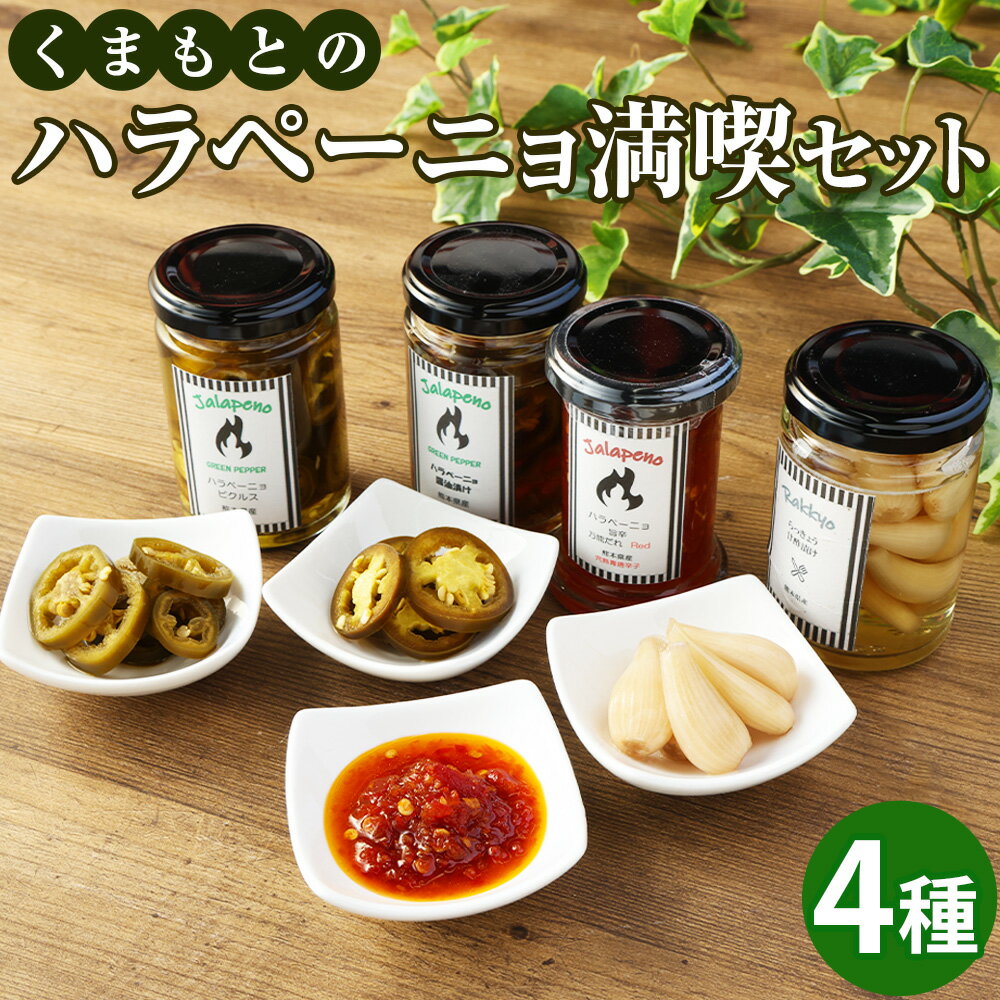 「らっきょう甘酢漬け」「ハラペーニョピクルス」「ハラペーニョ醤油漬け」「ハラペーニョ旨辛万能だれRed」の4種セットです。【ふるさと納税】くまもとのハラペーニョ満喫セット 4種 ピクルス 醤油漬け 万能だれ らっきょう 甘酢漬け らっきょ ペースト 調味料 ハラペーニョ おつまみ 詰め合わせ 食べ比べ 九州 熊本県 送料無料