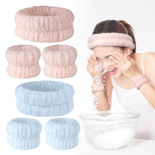 HUAZONTOM ヘアバンド 洗顔 リストバンド 2セット(6点)入り 吸水リストバンド 洗顔用ヘアバンド 優しくフィットする ヘアターバン 洗顔 手首 バンド 柔らかい 速乾 伸縮性あり マイクロファイバー製 ふわふわ 汗留め お風呂 レディース メンズ (ライトピンク+ライトブルー)