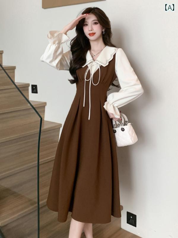 リボン ワンピース レディース プラス サイズの 女性の 春の 新作 フランスの レトロな ヘップバーン スタイルの 気質の スプライシング ドール カラーは、 肉を カバー し、 薄い ドレスを 披露 します