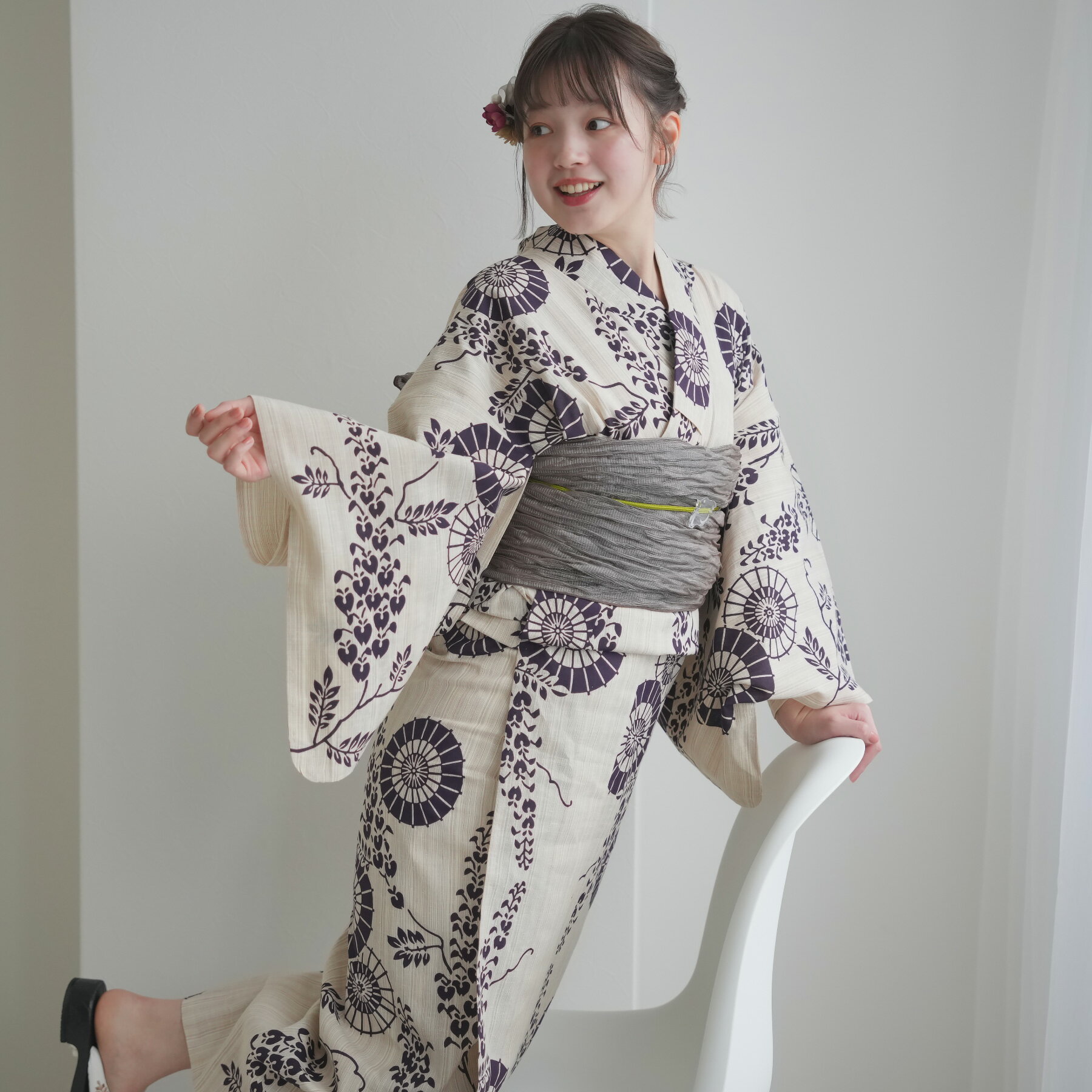 浴衣はひとりで着られる!レディース浴衣セット カンタンゆかた着付け動画公開中!【utatane×注染工房 日本製小幅生地使用 浴衣3点セット 先染めベージュ濃紫の藤御所車】特選シリーズ 注染 本染め にじみ 手染め ぼかし フリーサイズ 浴衣セット(ゆかた・帯・下駄) 日本製 国産 手縫い併用国内縫製 奈良の職人さんの手染め