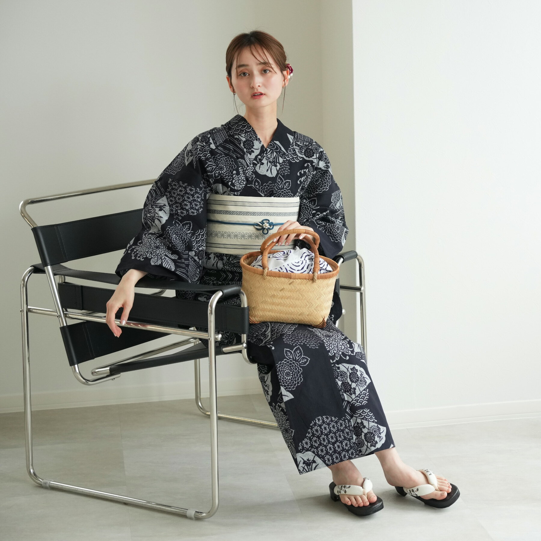 浴衣はひとりで着られる!レディース浴衣セット カンタンゆかた着付け動画公開中!【ニコアンティーク 高級変わり織 浴衣3点セット 大正浪漫ブラック縞と牡丹の染分け】 個性派きものブランドの新作 プチ(150-160cm)S 浴衣セット(ゆかた・帯・下駄)ニュアンスカラーレトロ うたたね 国産生地 国内染色 低身長