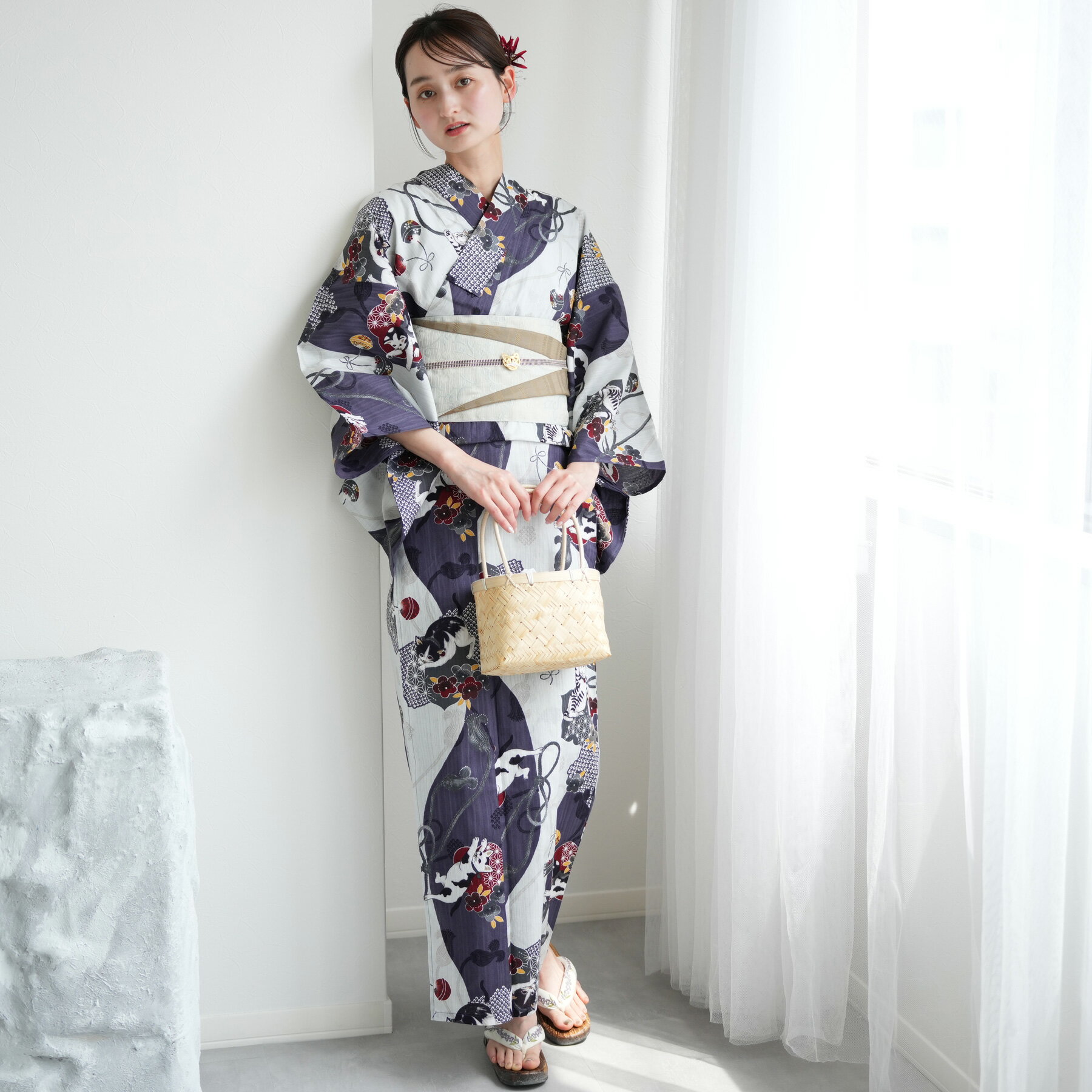浴衣はひとりで着られる!レディース浴衣セット カンタンゆかた着付け動画公開中!【ニコアンティーク 高級変わり織 浴衣3点セット 染め分け灰紫に大正浪漫ねこ】みんなと違う浴衣を着よう!個性派きものブランドNicoAntiqueの2025年新作 フリーサイズ 浴衣セット(ゆかた・帯・下駄)ですぐお出かけ レトロ 国産生地 国内染色
