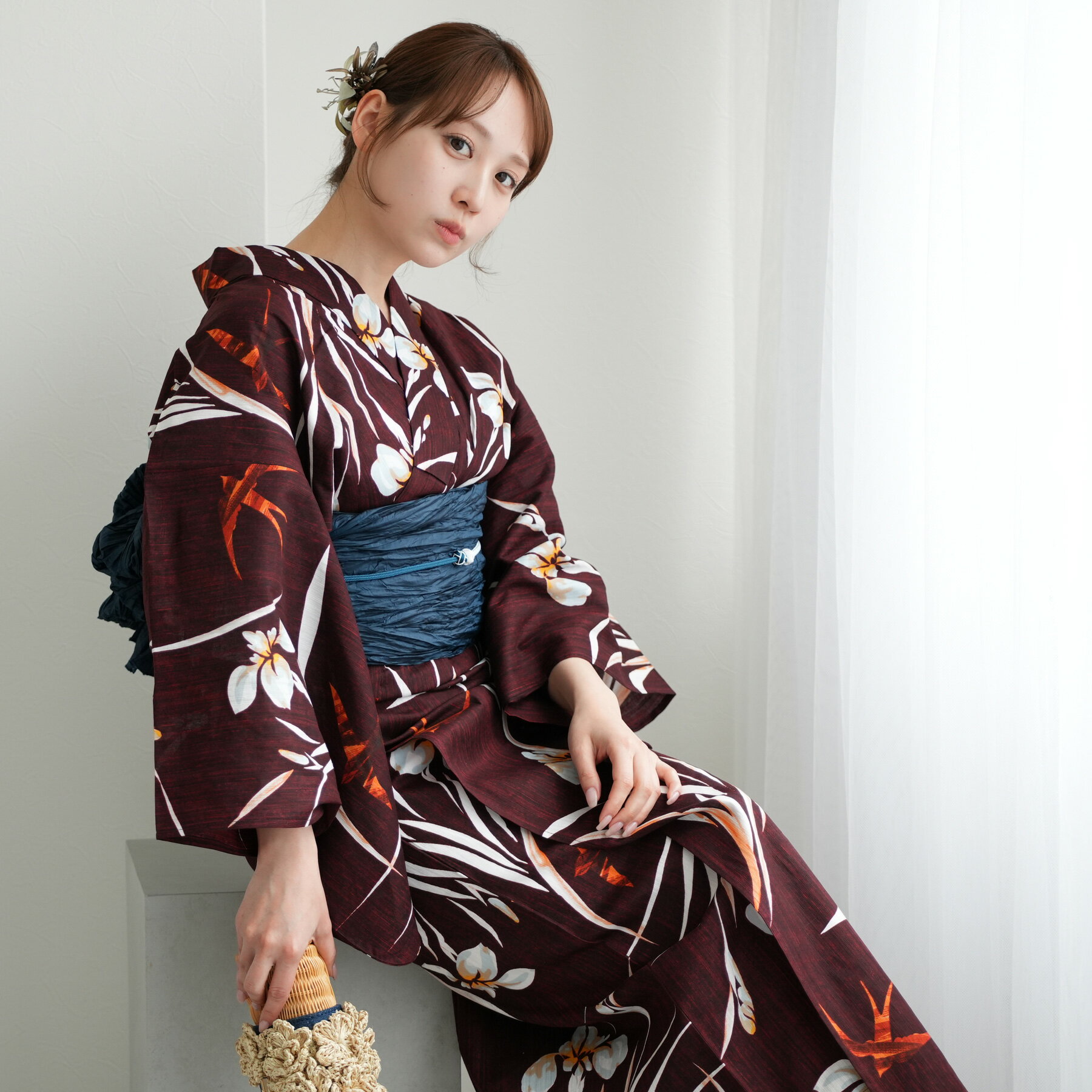 米井遥加(@rabbit____2)ちゃん着用!レディース浴衣3点セット【ニコアンティーク 高級変わり織 浴衣3点セット えんじに菖蒲とつばめ】みんなと違う浴衣を着よう!個性派きものブランドNicoAntiqueの2025年新作 フリーサイズ 浴衣セット(ゆかた・帯・下駄)ですぐお出かけ レトロ 国産生地 国内染色