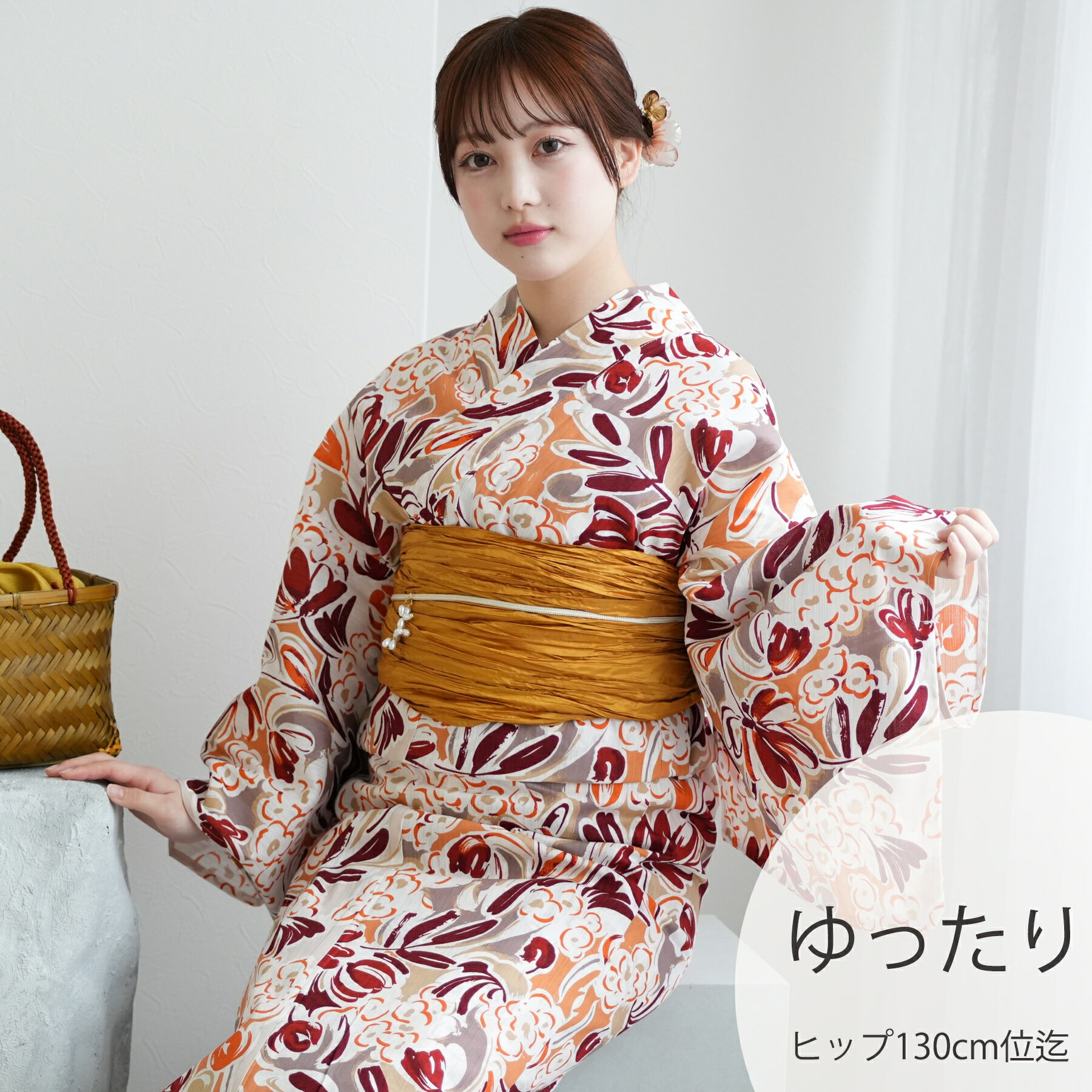 *+*+*+*+*+*+*+*+*+ ▼ひとりで簡単!自分でできる浴衣の着付け動画 ┣【ゆかたの着付け 動画】 ┣【兵児帯の結び方 動画】 ┗【半幅帯の結び方 動画】 *+*+*+*+*+*+*+*+*+ [商品画像について] ※商品画像はできる限り実物を再現するよう心掛けておりますが、お客様のモニターや閲覧環境によって大きく色味が異なる場合があります。 [商品在庫について] ※商品在庫は他店舗販売と共有しているため、更新のタイミングにより在庫切れの場合はやむをえずキャンセルさせていただく可能性があります。【セット内容】 浴衣・帯・下駄 ※上記以外のレースやオーガンジー飾り、帯締め等の小物類はセットに含まれません。 ※帯は手結び(ご自身で結ぶタイプ)です。 ※下駄はランダムコーディネートです(ご指定不可)。 ※浴衣は生地の裁断の位置によって柄の出方が異なります。 【素材】 浴衣:綿100% 帯:ポリエステル 下駄:桐 【適応サイズ】 3L ゆったりサイズ 適応身長 約155-165cm ヒップ130cm頃 【実寸サイズ】 身丈 約165cm・袖丈 約53cm・裄丈 約69cm 下駄:フリーサイズ(約22.5-24.5cm対応) 【原産国】 浴衣:生地 日本 / 縫製 中国 帯:日本 下駄:中国