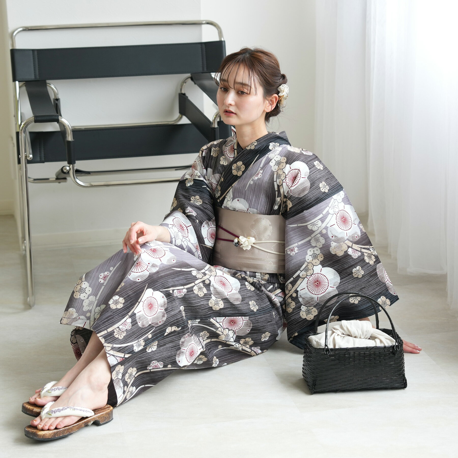 2分で完成!ここでしか買えない!着物屋が本気改良したプロ着付け見えするセパレート浴衣(二部式浴衣)3点セット【utatane セパレート高級変わり織 二部式浴衣3点セット かすれ黒ぼかしの梅】ここでしか買えない昭和初期アンティーク復刻版 フリーサイズ 浴衣セット(ゆかた上下・帯・下駄)ですぐお出かけ 古典レトロ うたたね 国産生地 国内染色 上質