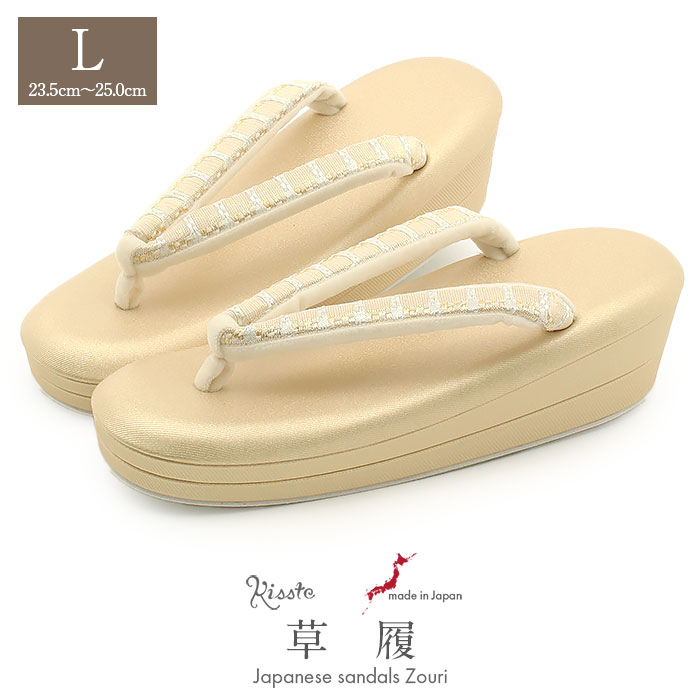 ◆商品情報◆ 結婚式の黒留袖や色留袖、訪問着などのフォーマルなおきものの装いに合わせていただける、礼装用草履です。 足当たりが良く弾力性に富み、長時間歩いても疲れにくいEVA素材の高反発クッション草履。 綿入りのふっくらとした鼻緒やこだわりある生地感・色でお着物のコーディネートを楽しめます。 かかとの高さは約6.0cmの高さ。草履の芯は2枚芯。横からのスタイルに華やかさをプラスします。 足裏の当たる部分はなだらかな曲線のため、前に滑りすぎずきもの初心者の方も履きやすくおすすめの草履です。 式場などでは貸し出しの草履もありますが、やはりおめでたい席や礼装の場面で真新しい綺麗な草履を身につけていることでいい気分で過ごせます。 フォーマルな装いを楽しみたい日のおともに、ぜひお手に取っていただきたい草履です。 ※草履の鼻緒は生地の取り方により、柄の出方が異なります。 お選びいただけませんが、それぞれ華やかなお品です。 ◆合わせる着物◆ 黒留袖 色留袖 訪問着 色無地 付け下げ 小紋 ◆用途◆ 結婚式 披露宴 お宮参り 入学式 七五三 祝賀会 園遊会 叙勲 授賞式 など ◆季節◆ 春 夏 秋 冬 ◆色◆ 草履台:ゴールド 鼻緒:ゴールド ◆サイズ◆ Lサイズ (適応サイズ:23.5~25cm) 長さ:約24.5cm 幅:約8.0cm 高さ:約6.0cm (つま先~前坪:約4.5cm 前坪~かかと:約20.0cm) ◆素材◆ 草履台/草履裏:合成皮革 鼻緒:帯地 ◆製造◆ 日本製 ◆備考◆ ◆配送方法◆ 宅配便 ▼ 草履と一緒に足袋はいかがですか ▼ ▼ サイズ別で探す ▼ ▼ 礼装用の商品はこちら ▼