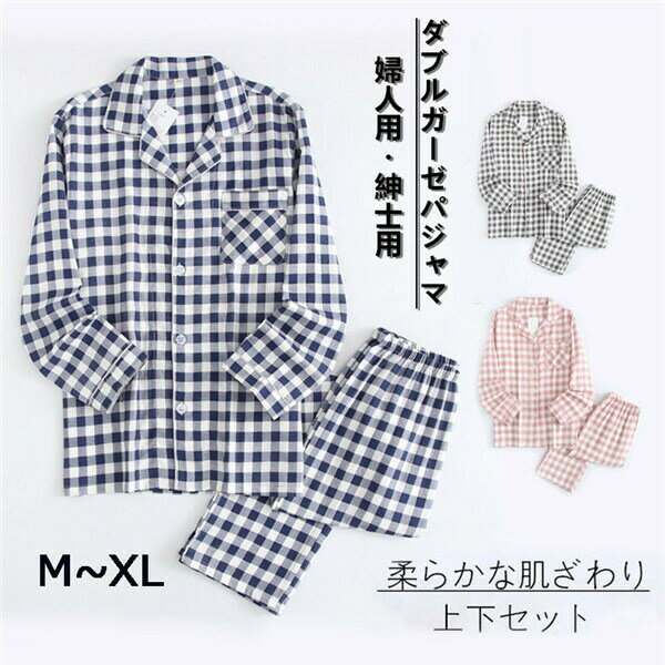かわいくお家でも過ごしたい方にオススメのアイテム 大量注文にも対応しています。【ルームソックス1点プレゼント】ルームウェア ペアパジャマ 二重ガーゼ ノートルチェック パジャマ メンズ 長袖 前開き(大きいサイズも) コットン 上下セット 部屋着 寝間着 カップル M L XL グレー ネイビー ピンク dh083c0c0g4