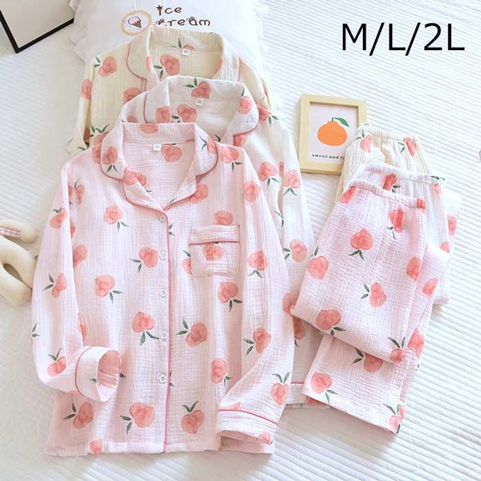 2層構造ガーゼ パジャマ 前開き 上下セット ピーチ柄【ルームソックス1点プレゼント】ルームウェア レディース 2層構造ガーゼ パジャマ 前開き 上下セット ピーチ柄 Vネック しわ加工 部屋着 お家時間 長袖 長ズボン 吸湿性 通気性 フルーツ柄 寝巻き M L XL 柔らかい 婦人 女性用 ホワイト ピンク イエロー dh040m3m3x0