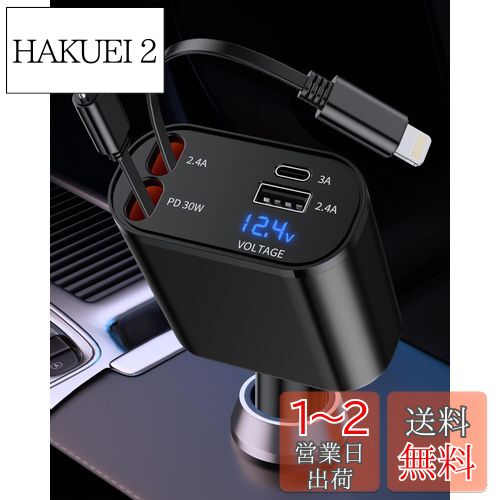 商品情報商品の説明主な仕様 [4台同時に充電可能 高速充電対応の多機能車 充電器] この車載充電器は、最新の高速充電規格に対応しており、iPhone、Androidスマートフォン、タブレット、Nintendo Switchなど、さまざまなデバイスを迅速かつ効率的に充電できる点が特徴です。最大4台のデバイスを同時に充電できるため、複数人で車内でも快適に充電が可能です。主な仕様: Power Delivery 3.0に対応したポートで、最大30Wの出力を提供し、iPhoneやAndroidデバイス、タブレットの急速充電に最適です。 Apple製デバイス向けの充電ポート。最大12Wの出力でiPhoneなどを充電できます。Quick Charge 3.0対応のUSB-Aポートで、最大12Wで対応するデバイスを高速に充電できますQuick Charge 3.0対応のUSB-Cポートで、最大15Wの出力で効率よく充電が可能です。車内の限られた環境でも複数のデバイスを同時に高速充電できる点が大きな利点です。br[巻き取り式シガーソケット車内を整理整頓] 80cmのケーブルが自動で引き出され、使用後は簡単に本体に巻き戻される巻き取り式デザインで、ケーブルが絡まることなく車内をすっきりと整理できます。これにより、車内がいつでも清潔で、使いやすくなります。br[電圧計を搭載、180°自由自在に角度調整] 180度にわたって自由に首振りができる設計により、デバイスの角度をお好みに合わせて調整可能です。どんな角度でも最適な位置で充電や使用ができ、車内のスペースに合わせて最も快適な角度でデバイスを利用できます。これにより、ドライブ中でも快適にデバイスを操作できます。 また、ブルーLEDデジタル表示の電圧計を搭載しており、車のバッテリー状態をリアルタイムで監視できます。バッテリーの異常を早期に発見し、予防保全が可能となるため、安全運転をサポートする重要な機能です。br[12V-24V車両に対応、安定した接続] 本シガーソケットは、12V~24Vの車両に対応しており、シガーソケットに簡単に接続できます。走行中でもしっかりと接続され、段差の多い道でも安全に使用可能です。また、万が一製品に関する問題があった場合には、24時間以内に専門のカスタマーサポートが対応します。br[安全設計で安心充電] 弊社の車載充電器過充電、過電流、過電圧、温度制御、短絡保護など、複数の安全機能を内蔵しており、デバイスのバッテリーを過度な負荷から守ります。安心して車内での充電を行える設計です。万が一、製品に関する質問や問題が発生した場合、専門のカスタマーサポートチームが迅速に対応し、24時間以内に解決いたします。安心してお買い求めください。br[CarPlay/Apple Play/AirPlay非対応] ご注意:製品サイズ(13.9*6.5*3.45cm、150g/5.61oz)。このーチャージャーは充電専用です。適合するのは、シガーソケットに対応した車で、USBジャックがある車には対応していません。CarPlay、Apple Play、AirPlayには対応していませんので、ご了承ください。