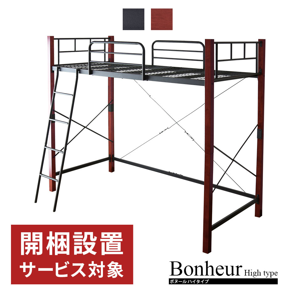 配送について 送料 無料 (沖縄・離島・一部地域見積り) ●商品詳細 -infomation- 商品名 ロフトベッド ボヌール 【Bonheur】hightype(ハイタイプ) サイズ hightype(ハイタイプ) :約W209×D102.5×H183(cm) 材 質 【構造部材】 スチールパイプ 脚:ラバーウッド 【表面加工】 スチールパイプ:粉体塗装 脚:タッカー塗装 重 量 本体重量:約42kg 耐荷重 耐荷重:200kg 梱包サイズ 〈2-1〉幅101×奥行106×高さ13(cm)/約42kg(梱包材含む) 〈2-2〉幅95×奥行44×高さ14(cm)/約16kg(梱包材含む) 備 考 組み立て時間 90分(2人) ※組み立ては必ず2人以上で行ってください ※ベッドフレームのみの販売となります。 ※本商品は大型商品の為、配送日時指定ができません。 ※他商品との同梱は出来かねます。 ※ご使用のモニターやディスプレイ等の環境によって、 実際の明るさや色と多少異なって見える場合がございます。 ※組み立て方や個体差により 表記と多少の差異が生じる場合がございます。 その他、記載事項ご確認の上ご注文ください。配送について 送料 無料 (沖縄・離島見積り) >>> 通常販売ページはこちら <<<