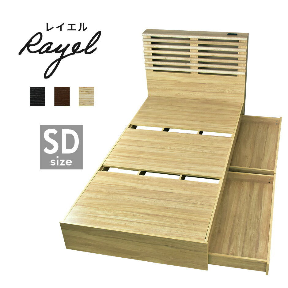 配送について 送料 無料 (沖縄・離島見積り) ●商品詳細 -infomation- 商品名 ベッドフレーム Rayel SD【レイエル セミダブルサイズ】 サイズ 幅121×奥行209×高さ88.5(cm) 材 質 ◆表面材質 合成樹脂化粧繊維板 ◆表面加工 メラミン加工 重 量 本体重量:約73kg 耐荷重 【本体】130kg 梱包サイズ 【梱包1】幅104×50×60(cm)/14.5kg(梱包材含む) 【梱包2】幅126×68×11(cm)/43kg(梱包材含む) 【梱包3】幅128×68×13(cm)/20.5kg(梱包材含む) 備 考 ※組み立ては必ず2人以上で行ってください ※ベッドフレームのみの販売となります。 ※本商品は大型商品の為、配送日時指定ができません。 ※他商品との同梱は出来かねます。 ※ご使用のモニターやディスプレイ等の環境によって、 実際の明るさや色と多少異なって見える場合がございます。 ※組み立て方や個体差により表記と多少の 差異が生じる場合がございます。 その他、記載事項ご確認の上ご注文ください。【ブランドストーリー】Velleベッドフレームの特徴 通気性と収納機能が特徴のベッドフレーム 毎日使うベッドだからこそ、快適さと実用性の両方にこだわりたい。そんな方におすすめなのが、通気性と収納力に優れたベッドフレームです。床板にはすのこ構造を採用しているタイプも多く、湿気を逃がしてカビの発生を抑えてくれるため、1年中快適な寝心地を保てます。さらに、ベッド下には引き出しや高さのある収納スペースを備えたモデルもあり、衣類や季節物をスッキリ収納可能。お部屋の空間を有効活用しながら、快眠と整理整頓を両立できます。 シングル、セミダブル、ダブルに加え、ワンルームに最適なセミシングルショートサイズもご用意 ライフスタイルやお部屋の広さに合わせて選べる、豊富なサイズバリエーションが魅力のベッドフレーム。定番のシングル、セミダブル、ダブルはもちろん、省スペースにぴったりなセミシングルショートサイズも展開。狭いワンルームや一人暮らしのお部屋にも収まりやすく、寝心地はそのままにお部屋を広く使えます。サイズが選べることで、家族構成やお部屋の間取りに合わせたレイアウトも自由自在。限られた空間でも、心地よく眠れるベッドを選びましょう。 宮棚には照明付きとコンセント2個口付きタイプなど便利機能あり 毎日の暮らしをちょっと便利にする機能が詰まった宮棚付きベッドも人気。就寝前の読書やスマホの充電に便利な照明やコンセントが備え付けられているモデルなら、ナイトテーブルいらずでベッドまわりがスッキリ。2口コンセント付きならスマホとタブレットを同時に充電でき、忙しい朝も快適にスタートできます。宮棚にはスマホやメガネ、小物を置けるスペースがあるので、必要なものを手元に置いて眠ることができ、日々の暮らしがより快適になります。 配送について 送料 無料 (沖縄・離島見積り)