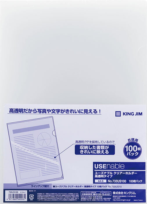 キングジムクリアホルダーユーズナブル high transparence A4 100 pieces 733US100 cane (ten sets)733US100トウ キング クリアーホルダー 733US100 キングジム 4971660042081(10セット)
