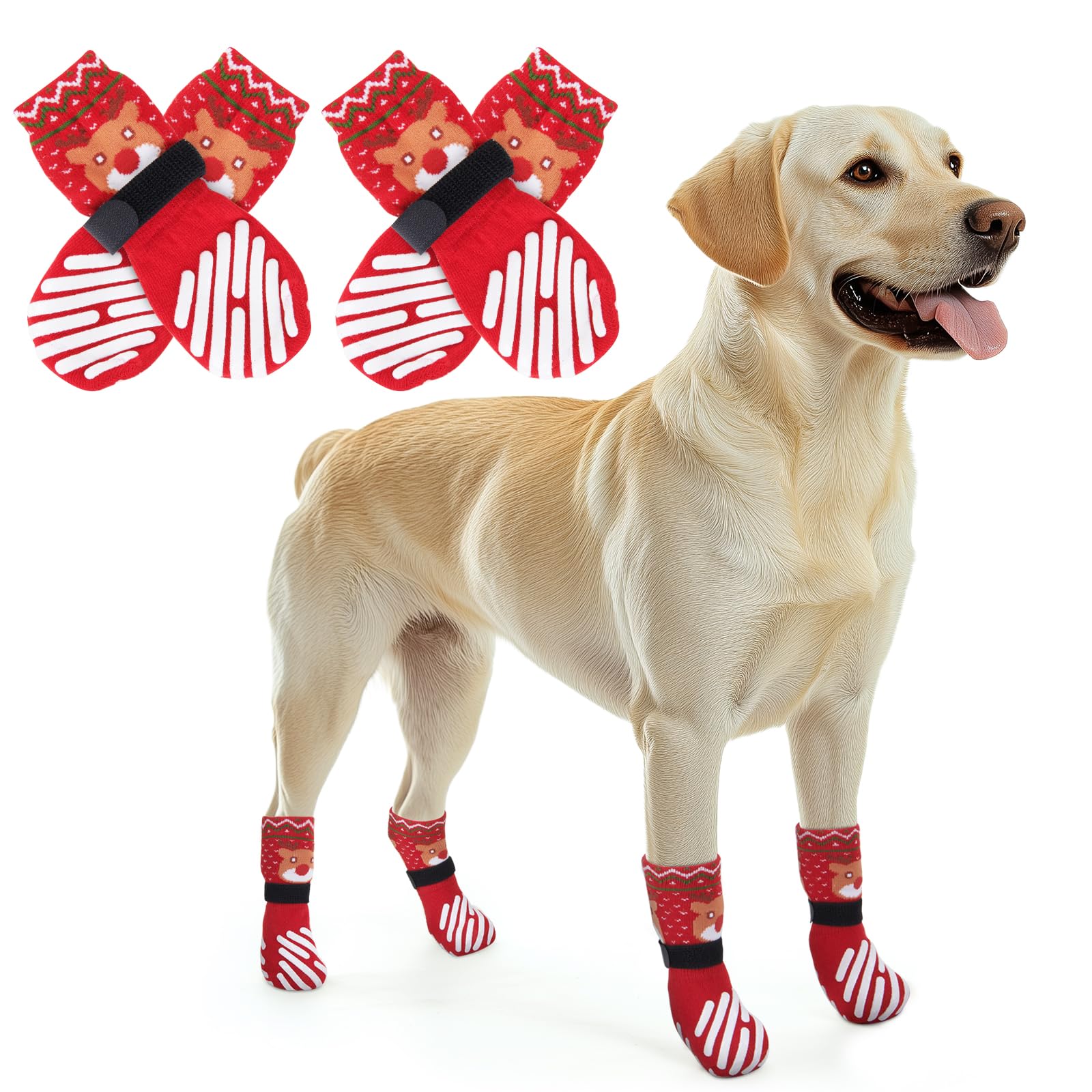 LOOBANI 犬 靴下 滑り止め 犬 滑り止め靴下 脱げにくい 老犬の介護 犬用 傷 舐め防止 マジックテープ付き 柔らかい 肉球保護 防寒 転倒防止 通気性 伸縮性 屋内外用 汎用 4個セット (レッド -ヘラジカ柄, M)