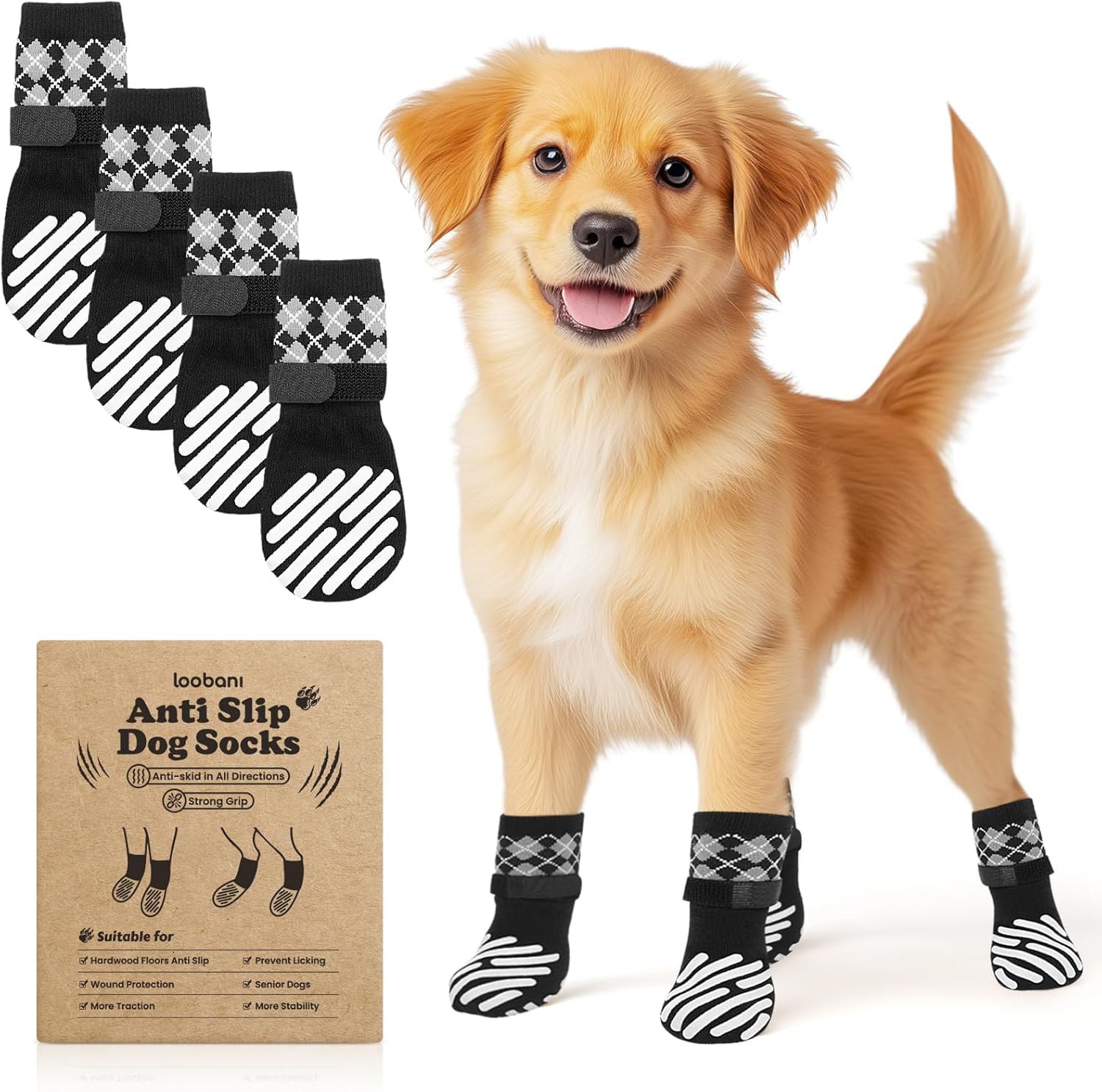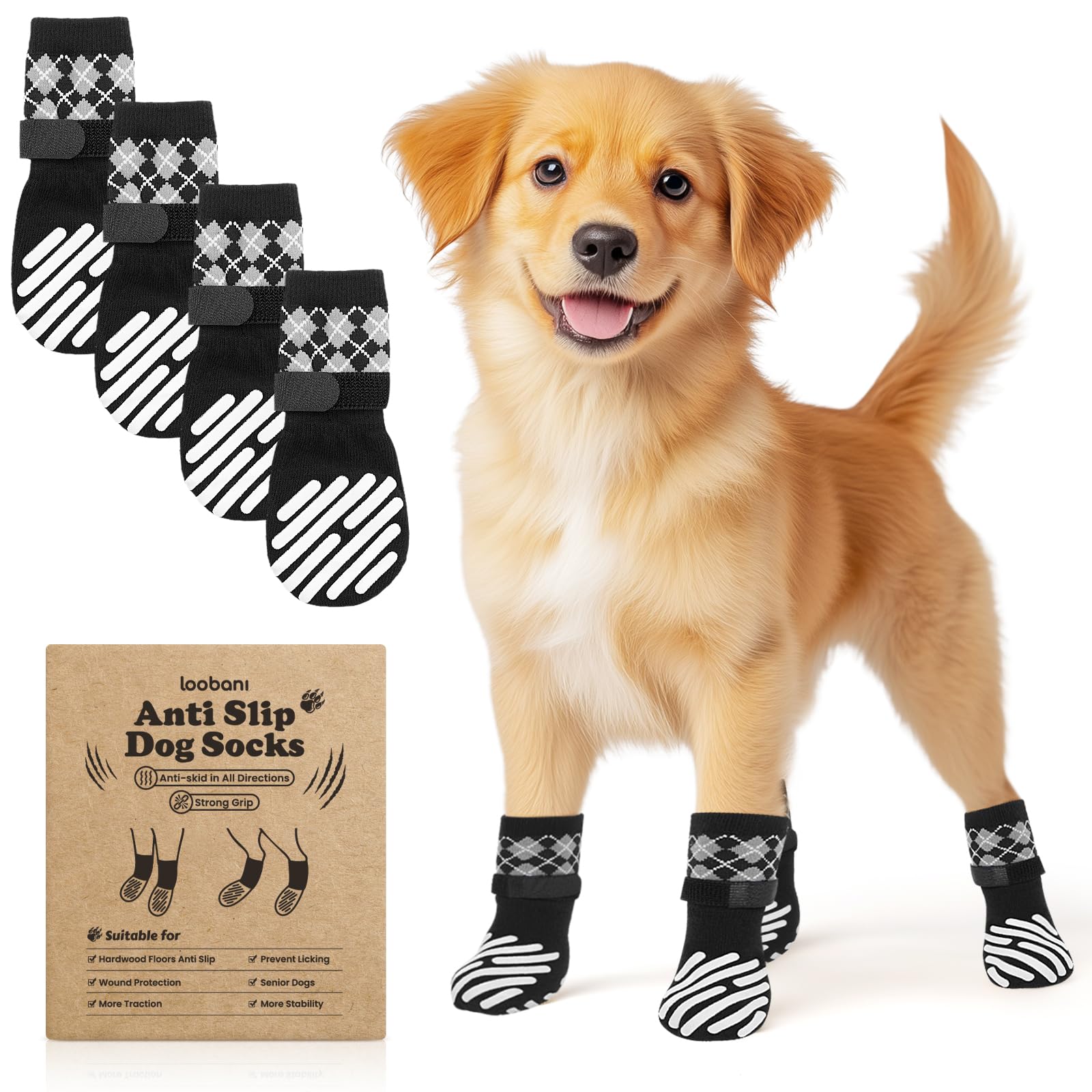 LOOBANI 犬 靴下 滑り止め 犬 滑り止め靴下 脱げにくい 老犬の介護 犬用 傷 舐め防止 マジックテープ付き 柔らかい 肉球保護 防寒 転倒防止 通気性 伸縮性 屋内外用 汎用 4個セット (ブラック, XL)