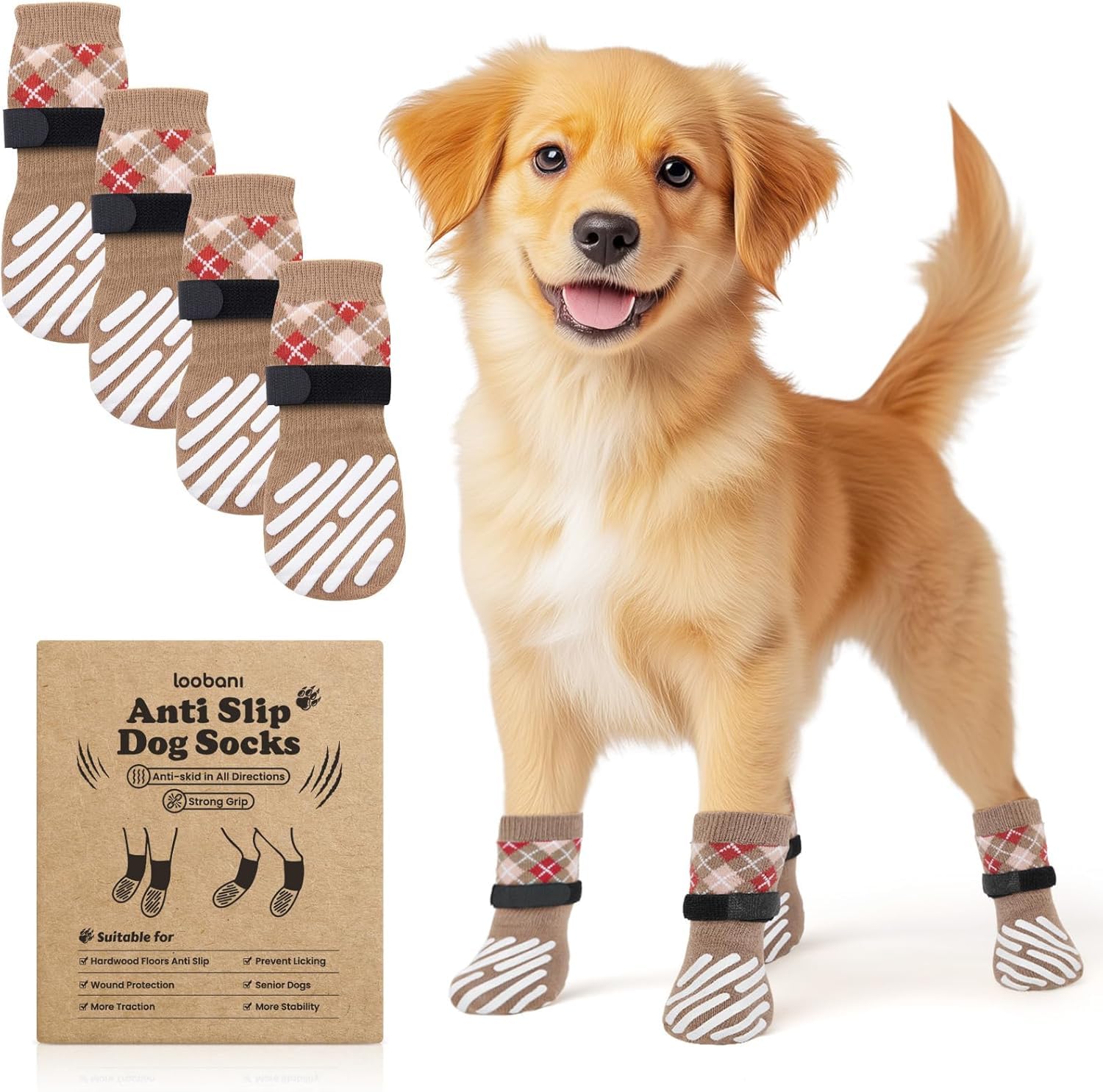 LOOBANI 犬 靴下 滑り止め 犬 滑り止め靴下 脱げにくい 老犬の介護 犬用 傷 舐め防止 マジックテープ付き 柔らかい 肉球保護 防寒 転倒防止 通気性 伸縮性 屋内外用 汎用 4個セット (ブラウン, XL)