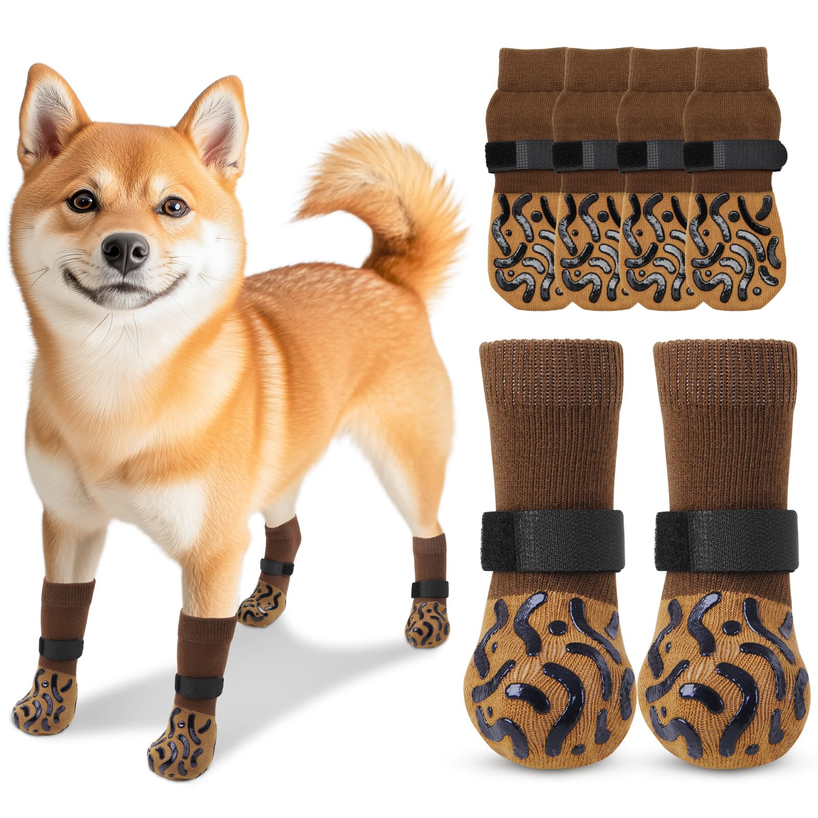 LOOBANI 犬 靴下 滑り止め 犬 滑り止め靴下 脱げにくい 老犬の介護 犬用 傷 舐め防止 マジックテープ付き 柔らかい 肉球保護 防寒 転倒防止 通気性 伸縮性 屋内外用 汎用 4個セット (ブラウン, S)