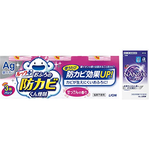 ・ 4g×3個 KBMS3*G・・FlavorName:せっけんSize:4g×3個・銀イオンの煙で黒カビ原因菌を除菌し、浴室のカビ発生を防ぐ「ルックプラスおふろの防カビくん煙剤せっけんの香り3個パック」・サイズ:4g×3 +ボディソープ1回分おまけ付・原産国:日本・商品モデル番号: KBMS3*G・原材料: 銀ゼオライト、ポリアルキレングリコール、発煙剤説明 商品紹介 ●浴室の天井から換気扇の裏まで銀イオンの煙がすみずみにいきわたり、黒カビの原因菌をまるごと除菌。黒カビをモトから防ぎ、カビ取り掃除の手間や回数を軽減します。 ●銀イオンの煙で、浴室全体の黒カビ原因菌をまるごと除菌できる ●除菌成分「銀イオン」の煙が、天井や換気扇の裏まで行き渡り、黒カビの原因菌をすみずみまで除菌します。 ●黒カビが生えにくくなり、カビ取り掃除がラクになる。 ●使用後は、黒カビが生えにくくなり、カビ取り剤を使った面倒な掃除の回数や負担が軽くなります。 ●定期的に使うことで、防カビ効果が高まる ●1ヶ月ごとの定期的な使用によって銀イオンの防カビ効果が高まり、カビ取り剤を使わなくても、普段の掃除だけでキレイが続きます。 ●せっけんの香り 原材料・成分 銀ゼオライト、ポリアルキレングリコール、発煙剤 使用方法 (1)カビ取り掃除をしてから、水を入れて浴室の中央に置く。 (2)煙が出始めたら、浴室から出てドアを閉め、1時間半以上放置する。 (3)窓を開けたり換気扇を作動させる等、充分に換気する。 【使えないもの】銅、しんちゅう、トタン製の素材のものは煙が触れないよう、覆いをするか浴室外に出す。 ★大理石の浴室や、ユニットバスでもお使いいただけます。