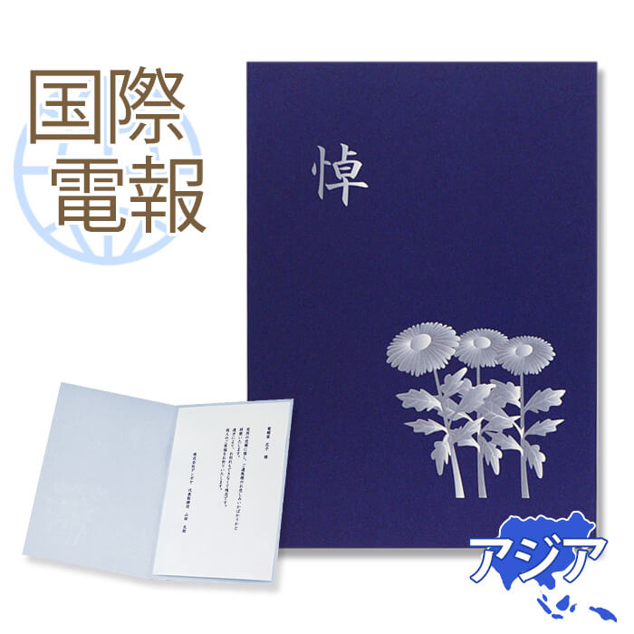 【お通夜・ご葬儀などのお供え物】電報・弔電・お悔やみ電報・通夜・通夜式・葬儀・葬式・前夜式・告別式・ミサ・社葬・法事・法要・弔事・お供え・御供物 【法事・法要などのお供え物】供花・仏花・お供え・献花・枕花・訃報・法事・年忌法要・法要・四十九日・一周忌・弔事・年忌・命日・お悔やみ・慰霊祭・新盆・初盆・喪中見舞い・喪中はがきが届いたら・ペット葬 【主な用途】電報・弔電・お悔やみ電報・国際電報・海外電報・海外の葬儀お悔やみ電報 深悼 【国際エクスメール アジアあて専用】 301 深悼 深悼の辞 ご逝去の報に接し、心から哀悼の意を表します。深い紺にシルバーで書かれた“悼”の文字と三輪の菊の花が、故人に対し心からお悔やみする気持を伝えます。菊花はエンボス仕上げです。 カードサイズ 縦220mm×横158mm 材質 再生紙(ECO paper) 加工 エンボス 地域 お届け国名(名宛国) 配達日数 海外加算料 アジア インド / インドネシア / ベトナム / 韓国 / カンボジア / シンガポール / スリランカ / タイ / 台湾 / 中国 / ネパール / パキスタン / バングラデシュ / フィリピン / ブータン / ブルネイ / 香港 / マカオ / マレーシア / モルディヴ / モンゴル / ラオス / ミャンマー 2~10日後(国別配達日数を参照) 2,600円 国別配達日数 ※国別配達日数は必ず配達できる日数ではなく、標準的な配達日数です。土日・祝日にかかる場合や、税関検査の遅れなどの要因により、配達が遅延することがあります。また、季節的な要因(クリスマス・新年・冬季など)や天災・テロなどの事情で遅れることもありますので、ご了承ください。