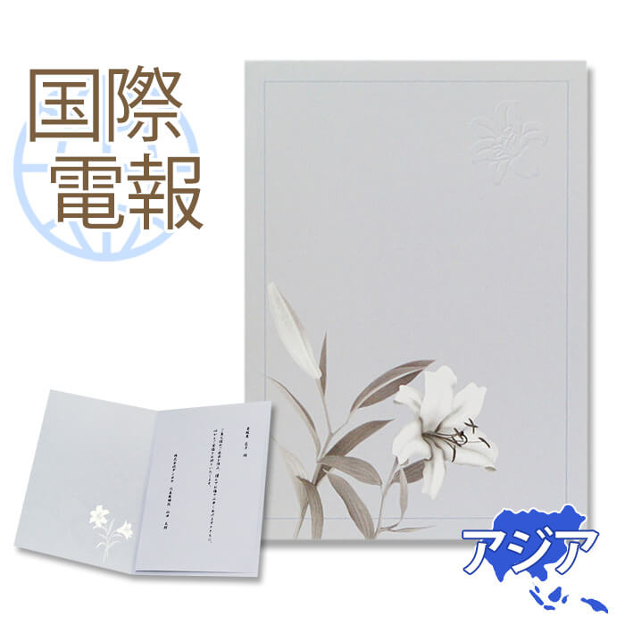 中国・韓国・台湾などアジア各国へお悔やみ電報・弔電をリーズナブルにお届けします 安らぎのひかりの彼方へ国際電報 弔電 お悔やみ 紙素材カード 「白い百合」 【海外 アジアあて専用】 送料無料 海外電報 弔電 海外葬儀 訃報 海外在住 ビジネス 取引先 現地法人 海外支店 中国 韓国 台湾