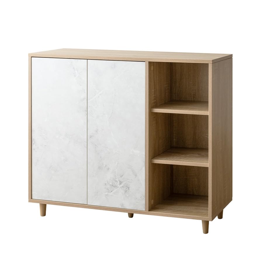 美しい木目×ストーン柄のバイカラーデザインがおしゃれなキャビネット。 無駄な装飾を省いたノイズレスデザインが、落ち着きのある美しい空間を演出します。 また、奥行31cmとスリム設計ながら大容量の収納スペースがあり、お部屋の小物をまとめて収納可能。 リビングやキッチンなどの限られたスペースにもすっきり置いていただける、デザイン性と実用性を兼ね備えたキャビネットです。 サイズ: 幅96cm×奥行31cm×高さ81cm 素材: パーティクルボード(メラミン貼り) 天然木 【梱包サイズ】102cm×38cm×18cm 【梱包重量】約28.5kg 【商品重量】約26.7kg 【耐荷重】天板:約10kg、扉収納スペース各上段:約3kg、扉収納スペース各下段:約5kg、オープン収納スペース可動棚:約2kg、オープン収納スペース下段:約5kg ※組み立て時間:2人以上で約45分 ※プラスドライバーをご用意ください。 ▼沖縄・北海道・離島への配送は別途配送料が必要になる場合がございます 離島に関しましては、追加で別途中継費用が必要になる場合がございます。 ▼商品の仕様やデザインは、品質に問題がない程度に予告なく変更させていただく場合がございます 商品の仕様やデザインは随時改善をしており、入荷のタイミングによってはデザインが変更されている場合がございます。 何度も同じ商品をご注文しているお客様はくれぐれもご注意下さい。 部品、生産国、脚部の形状、縫製、カバー類の色や形、サイズなどに少々誤差が発生する場合がございます。 予めご了承を宜しくお願い致します。関連商品【10/10(金)20~24時限定 ポイント2倍+LINEクーポン】キ...【10/10(金)20~24時限定 ポイント2倍+LINEクーポン】キ...【10/10(金)20~24時限定 ポイント2倍+LINEクーポン】お...15,250円15,900円14,740円【10/10(金)20~24時限定 ポイント2倍+LINEクーポン】キ...【10/10(金)20~24時限定 ポイント2倍+LINEクーポン】ラ...【10/10(金)20~24時限定 ポイント2倍+LINEクーポン】カ...15,650円16,020円15,000円【10/10(金)20~24時限定 ポイント2倍+LINEクーポン】キ...【10/10(金)20~24時限定 ポイント2倍+LINEクーポン】ク...【10/10(金)20~24時限定 ポイント2倍+LINEクーポン】キ...14,240円14,360円16,280円【10/10(金)20~24時限定 ポイント2倍+LINEクーポン】ド...【10/10(金)20~24時限定 ポイント2倍+LINEクーポン】ク...【10/10(金)20~24時限定 ポイント2倍+LINEクーポン】光...13,840円14,220円14,220円