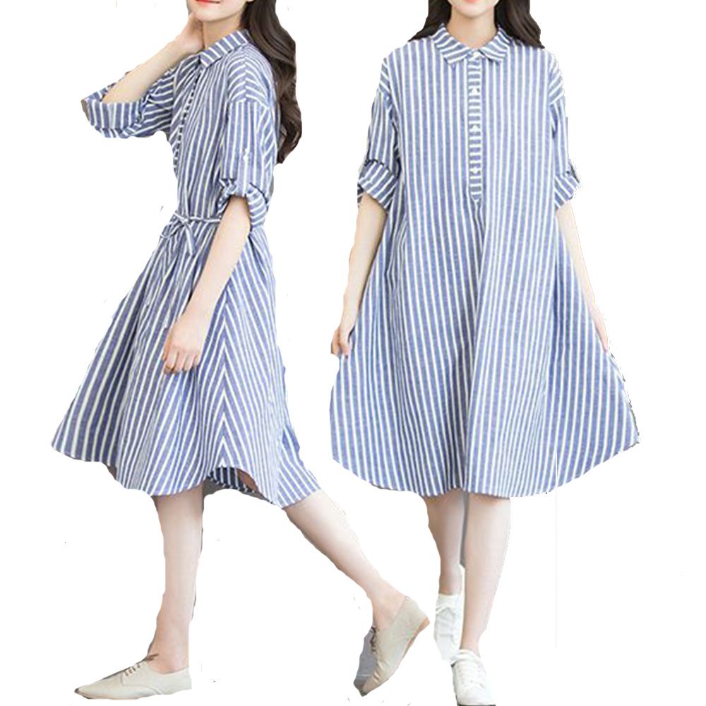 部屋着からお出掛けまでマルチに使えるストライプワンピース♪ウエストは付属の紐で縛って調整可能です。 紐を使用せずにゆったりとした感じでも着用して頂けます。一部予約 レディース服 ストライプ ワンピース 五分袖 ゆったり シンプル おしゃれ 体型カバー きれいめ 大人カジュアル コーデ 青 白 上品 かわいい 清楚 フェミニン ナチュラル 春 夏 秋 コットン 快適 S M L XL 2XL