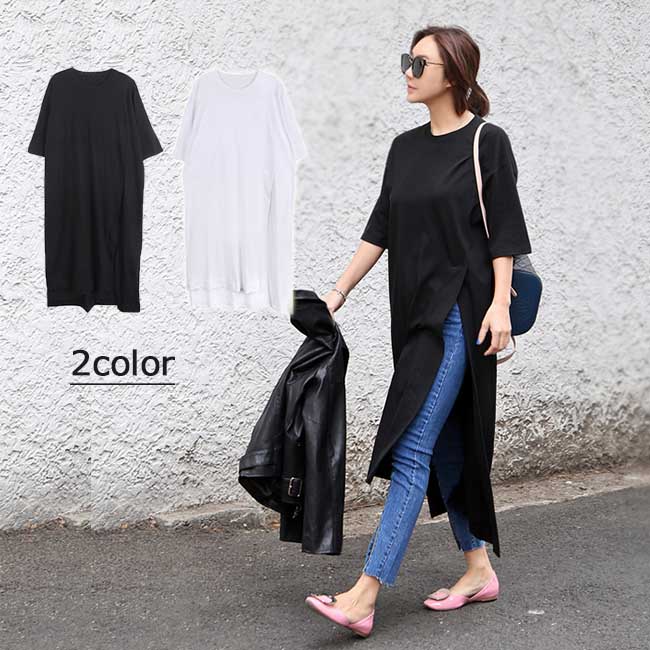 このスリット ロングTシャツは、シンプルでおしゃれなデザインが特徴。夏にぴったりのコットン素材で、20代から40代の女性におすすめです。スリット ロングTシャツ ロングtシャツ レディース 半袖 膝下 おしゃれ 夏 Tシャツ ワンピース ロンT コットン ブラック ホワイト ワンピ ゆるワンピ 大人シンプル 無地 クルーネック 20代 30代 40代