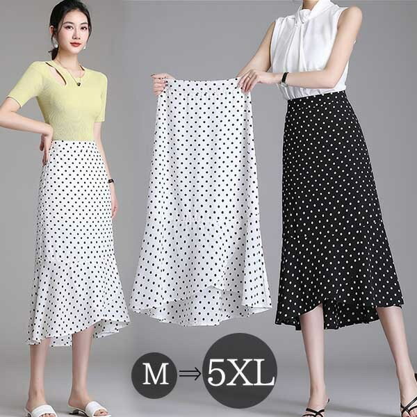 ボディにフィットしたラインから、裾にかけてふわっと広がるマーメイドシルエットは華奢見え効果抜群 韓国 大量注文にも対応しています。スカート レディース ぽっちゃり 大きいサイズ 体型カバー 春 夏 ドット柄 水玉 チューリップ裾 ブラック ホワイト きれいめ お出かけ デート デイリー 女子 シフォン シンプル 落ち感 ひらひら M 5XL dd107x1x1g4