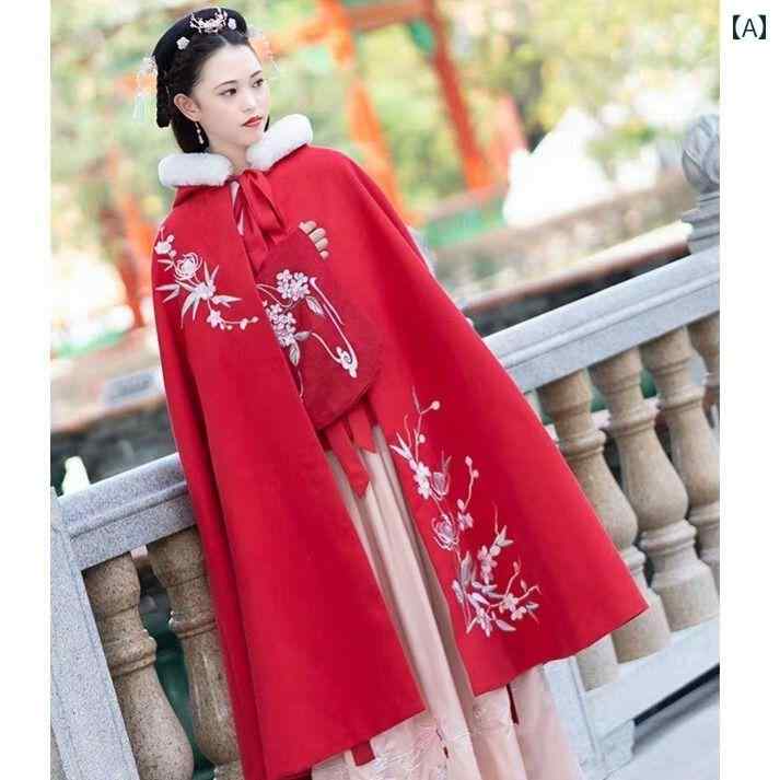 【予約販売5~12営業日での発送】ケープ マント レディース 秋冬 中国風 伝統的 厚手 防寒 羽織り 刺繍 フェイクファー フード付き チャイナスカート ネックウォーマー 漢服 舞台 パフォーマンス 演劇 撮影 衣装 赤 白 緑