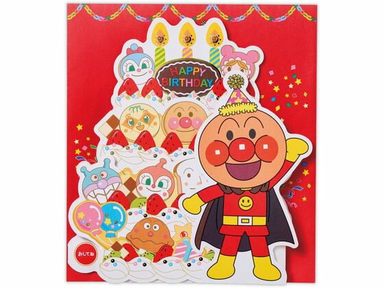 商品説明・アンパンマンの誕生お祝いカードです。 ・カードを開くとケーキを持ったアンパンマンが飛び出します。 #メッセージ内容 表面:HAPPY BIRTHDAY 中面:おめでとう #本体サイズ(約):[カード]縦113×横200mm [封筒]縦120×横213mm #枚数:[カード]1枚 [封筒]1枚