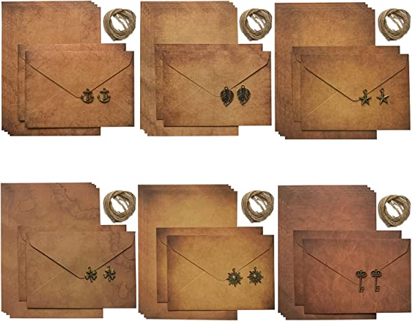 タイプ:レトロ封筒 レターセット 手紙 クラフト用紙 アンティーク調 招待状 結婚式 お祝い手紙 挨拶状など用 封封筒 レターセット 手紙 クラフト用紙 アンティーク調 招待状 結婚式 お祝い手紙 挨拶状など用 封筒6種12枚+便箋24枚+チャーム装飾12個+麻ひも12本 送料無料
